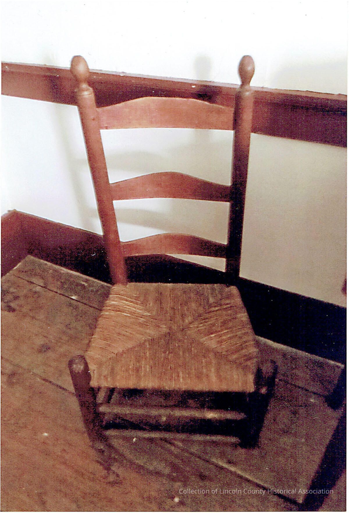 Child's chair, ladderback - 3 panels. Rush seat, single turned knob on back. Remnants of red paint.Dimensions