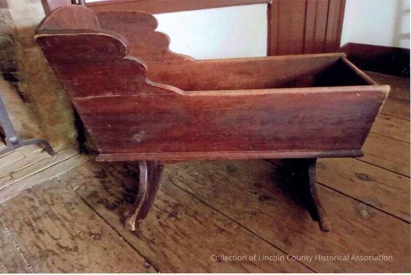 Child's cradle with open hood - decorative curves at end of 2 rockers and hood. Stain or varnish.