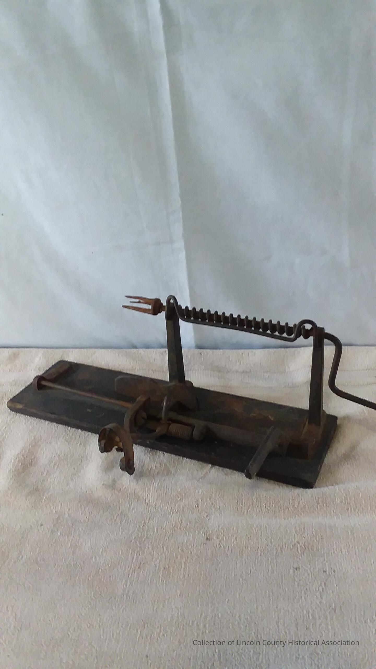 Hand turned parer attached to a wooden base with screws. Spring held knife blade