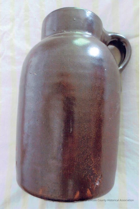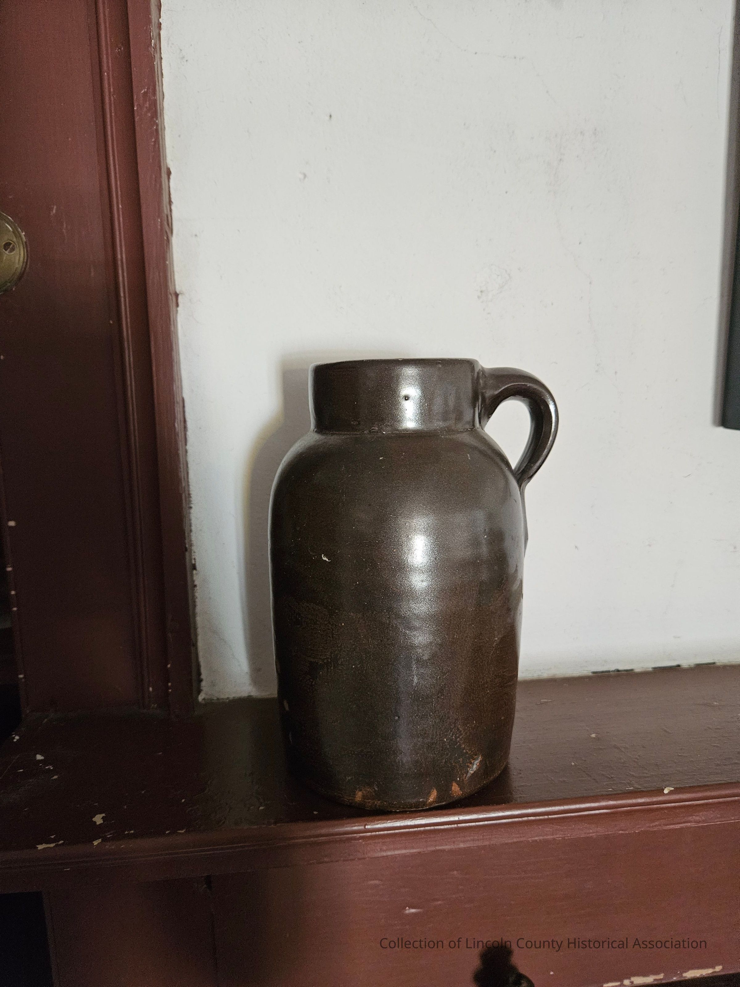 Cylindrical, brown glazed jug with a single handle. With a wide opening at the top.