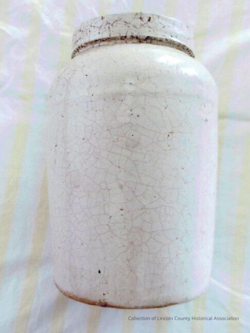 Cylindrical Jar with a white heavy, ecru, crackled glaze. Is missing its lid.