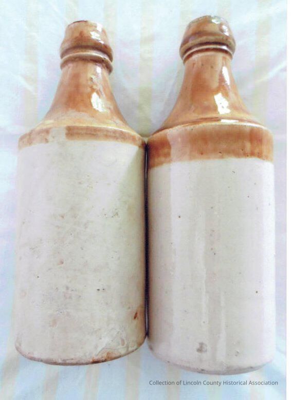 Pair of cylindrical ceramic bottles with tan glaze at top and white glaze below.Made/Created