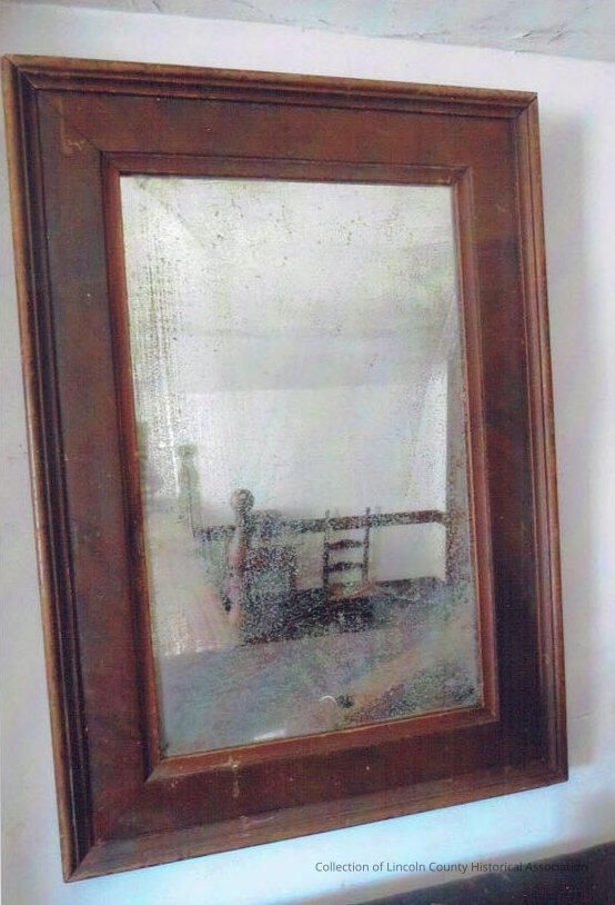 Mirror flaking, frame falling apart . Glass is disfigured because reflecting element has decomposed.