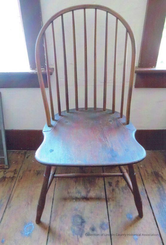 Bamboo style Windsor chair with 9 spindles. Spindles extend through top of the arched back. Legs extend through the pine seat with small wooden wedges inserted into the exposed top of the leg to hold it in place. Curved groove on seat in front of spindles and on back of seat as well.Made/Created