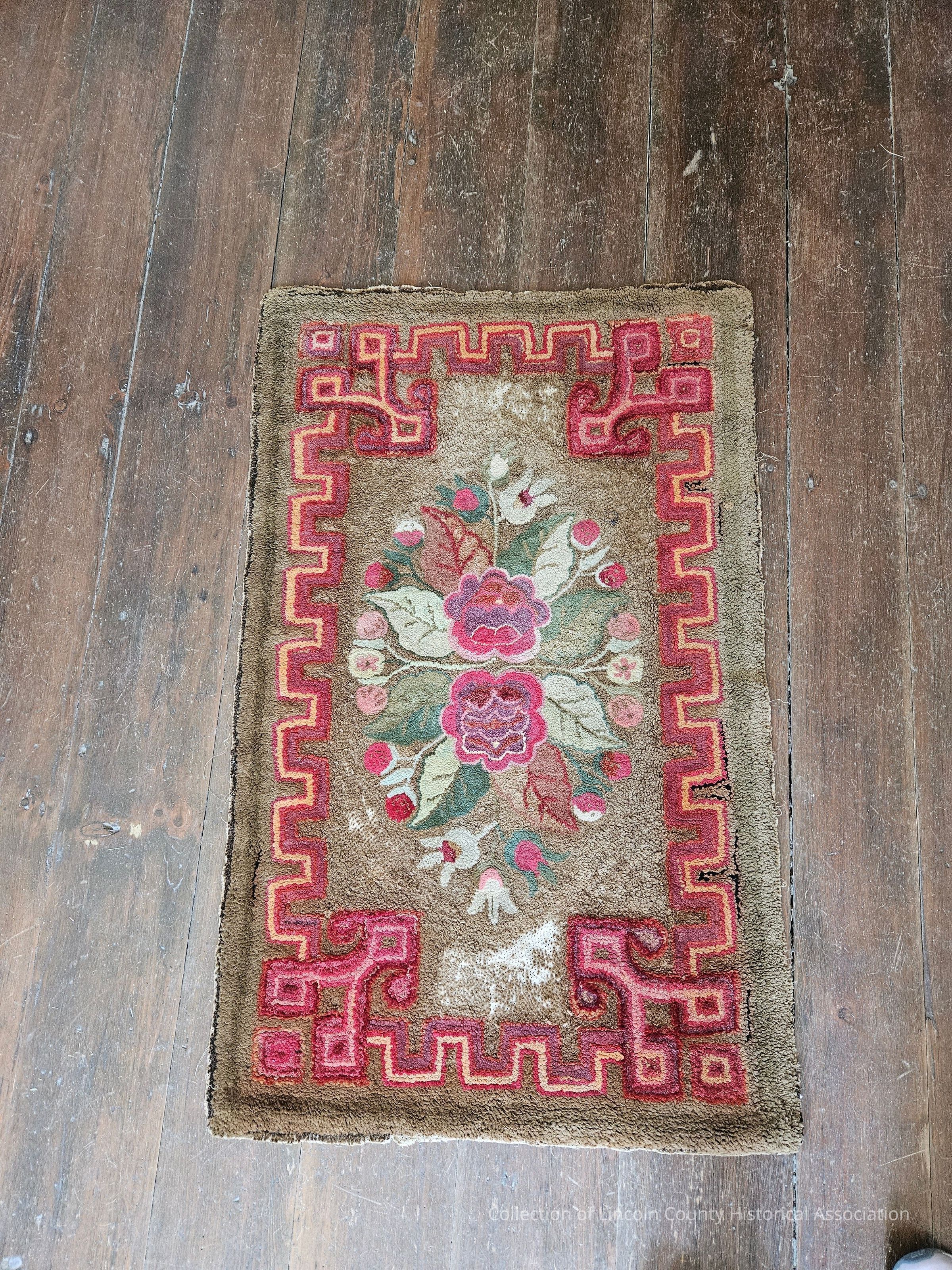Wool and burlap hooked rug with red, green and white floral design in the center and a geometric border.