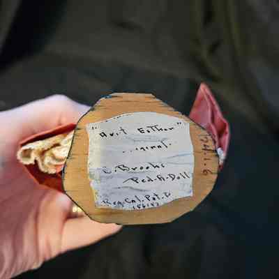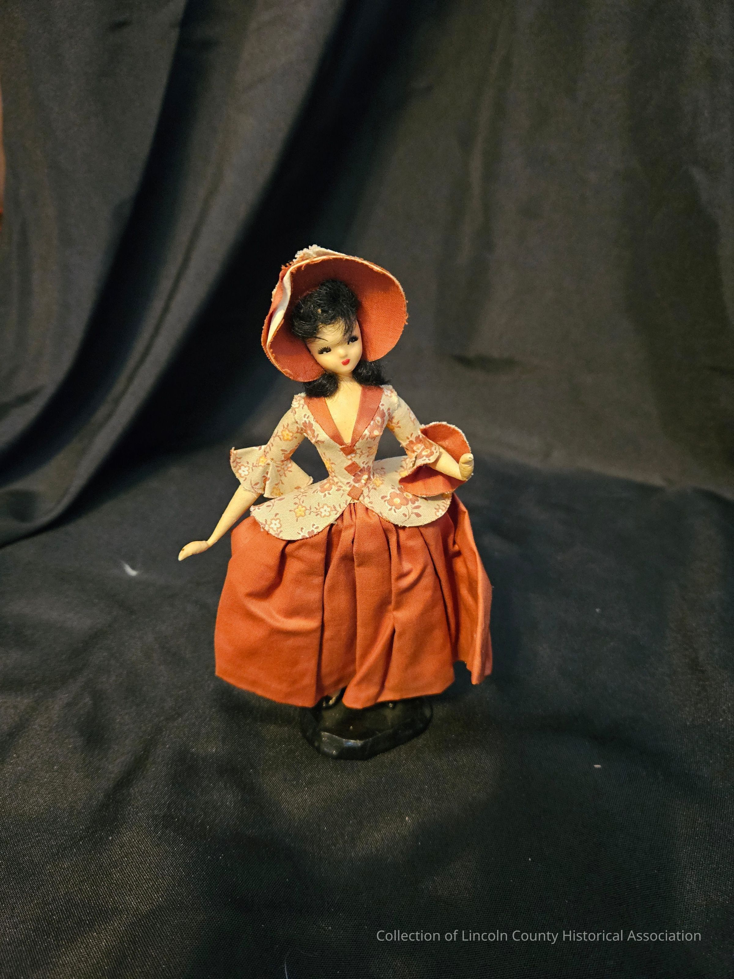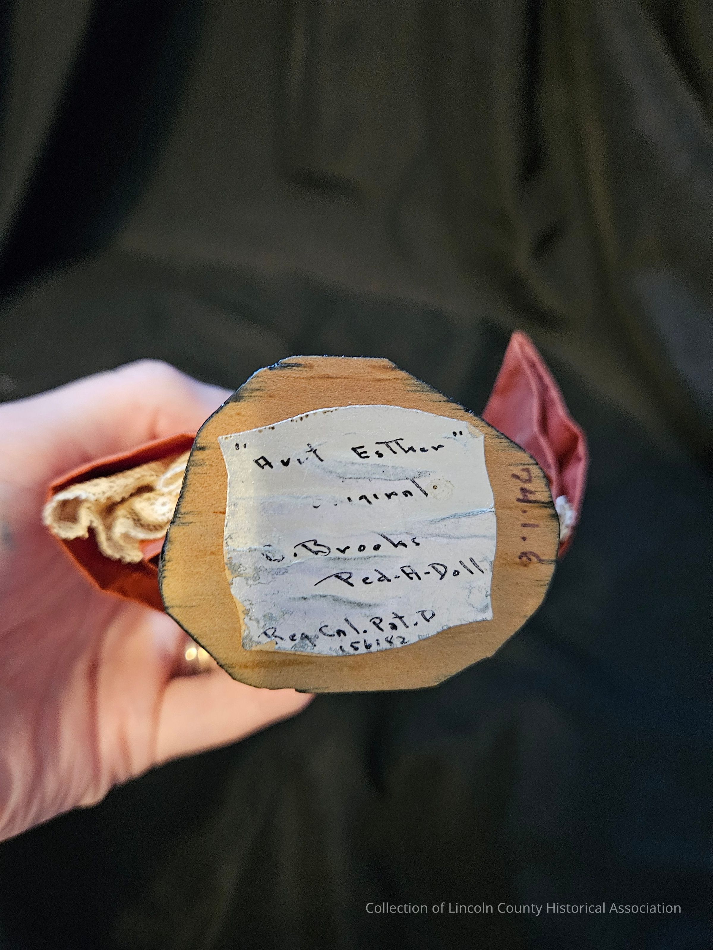 Doll is meant to represent the "Aunt Esther" character from the "Away Goes Sally" book series by Elizabeth Coatsworth of Nobleboro, ME. The series is set in the 18th century and follows a family moving from Massachusetts to Maine. It was originally published in 1934.