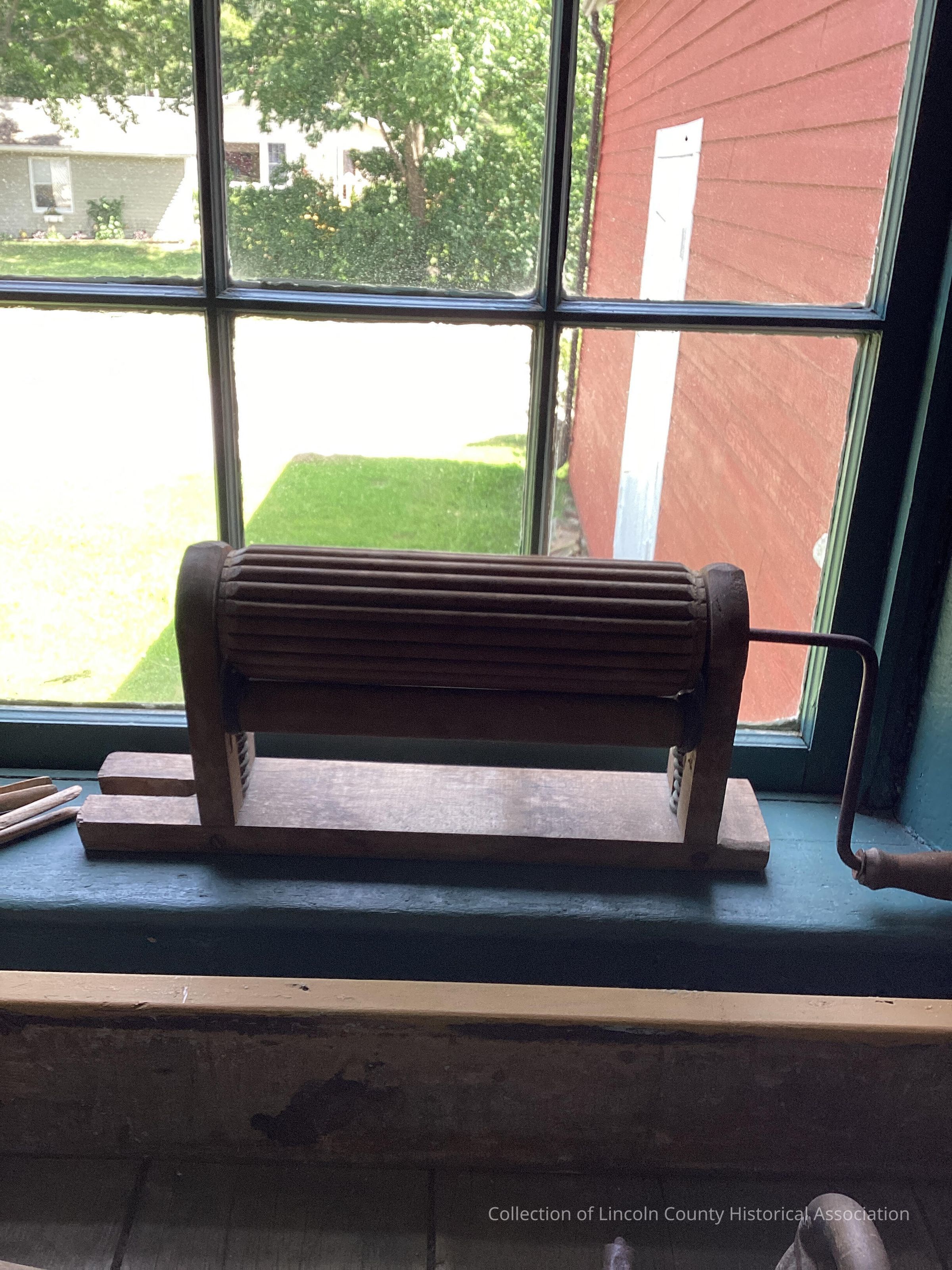 Wringer (mangle). Circular ribbed mangle supported by two vertical blocks set into a larger horizontal wooden block. Mangle rotated by a wooden handle attached to an iron crank. Wood used is hardwood.