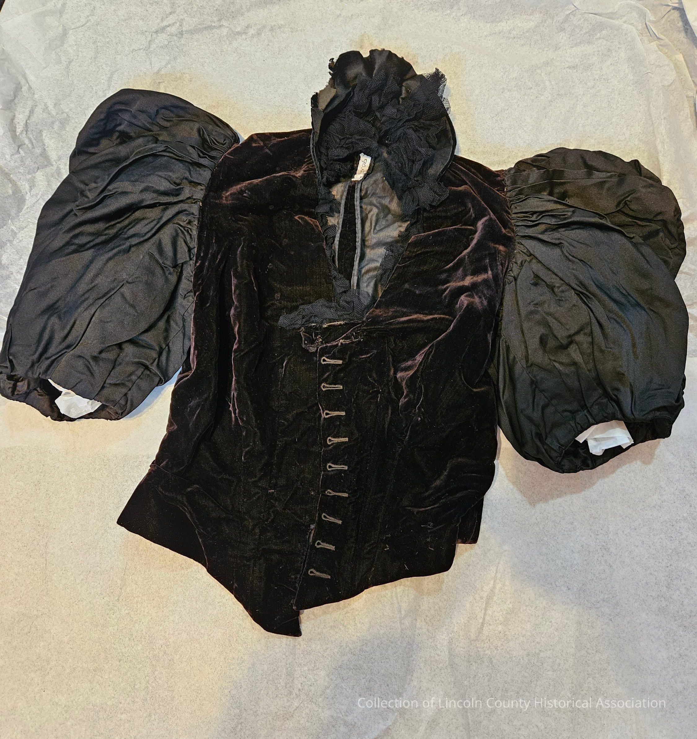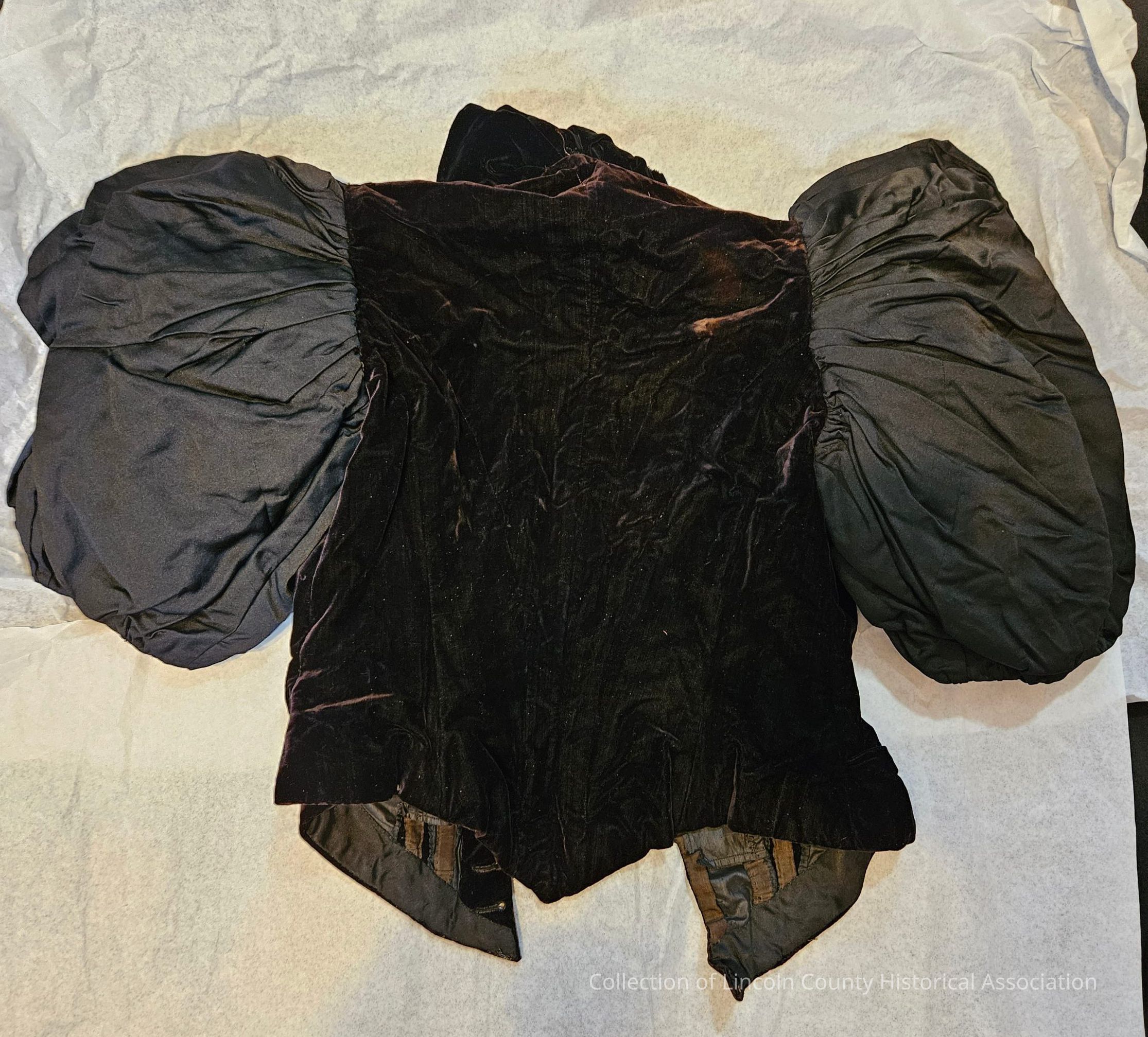 Black satin bodice with short puff sleeves. Black velvet body. Ruffled lace collar. Nine buttonholes in the front, no extant buttons. Boning around waist. Lined with black cotton fabric. Some machine stitching and some hand stitching.Clothing/Dress/Costume Details
