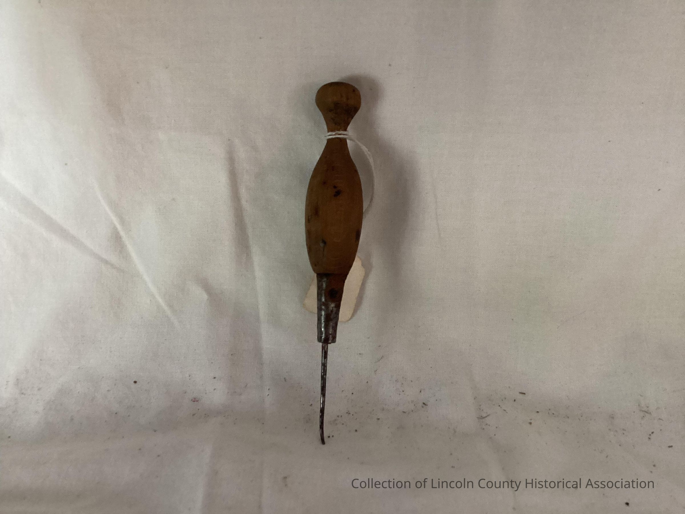Cobbler's awl. Sharply pointed metal shaft set into a wooden handle.Made/Created