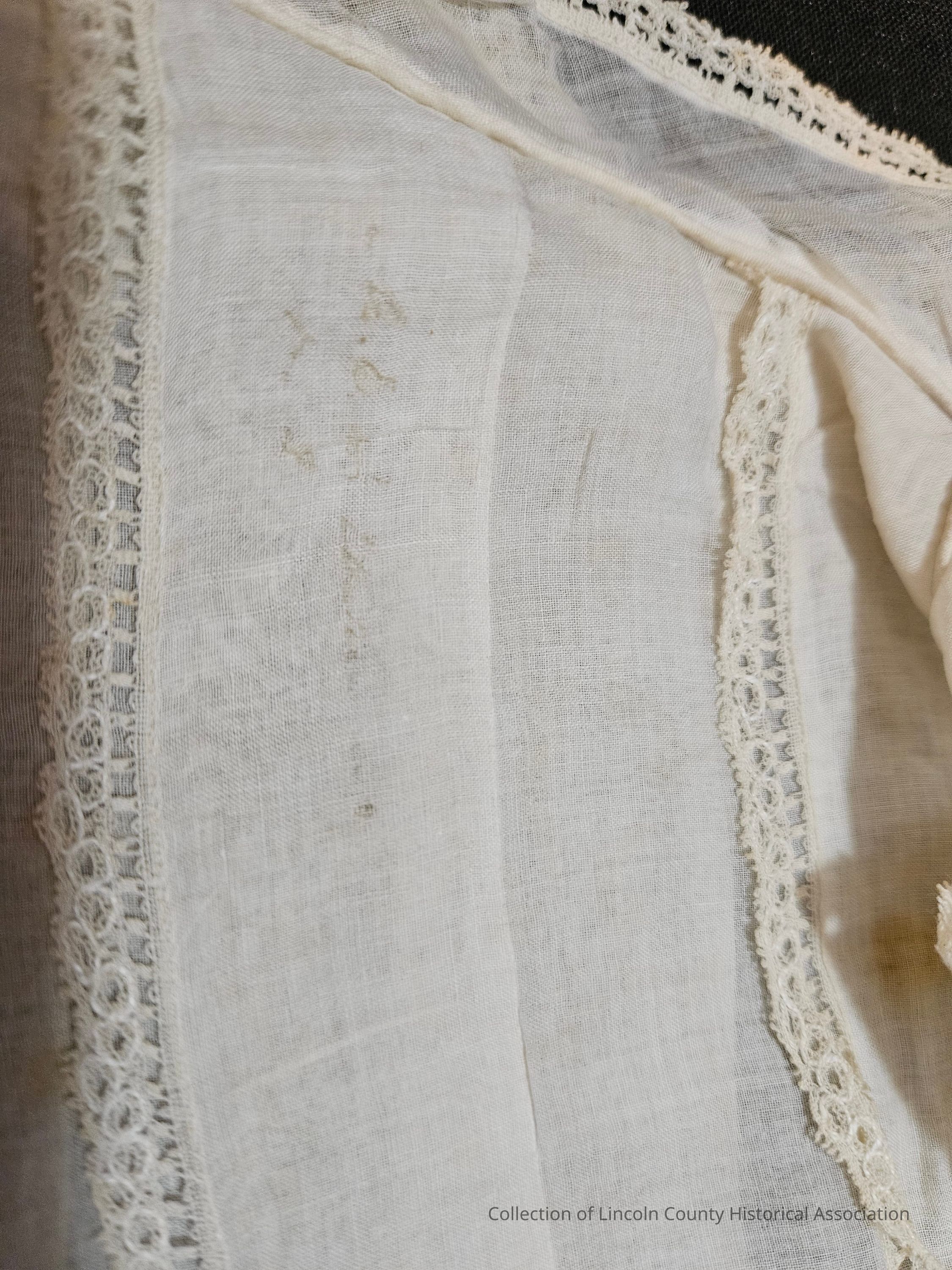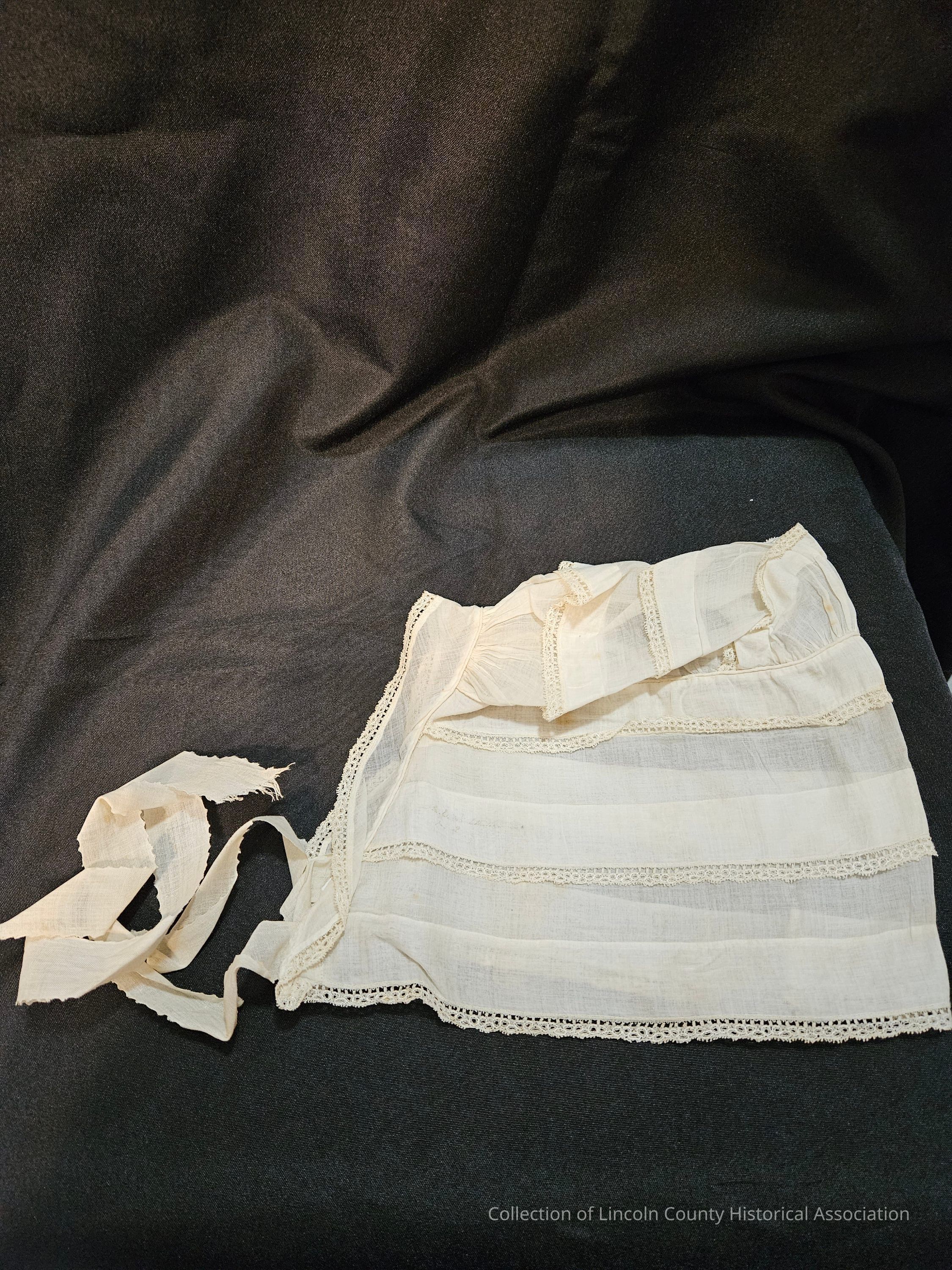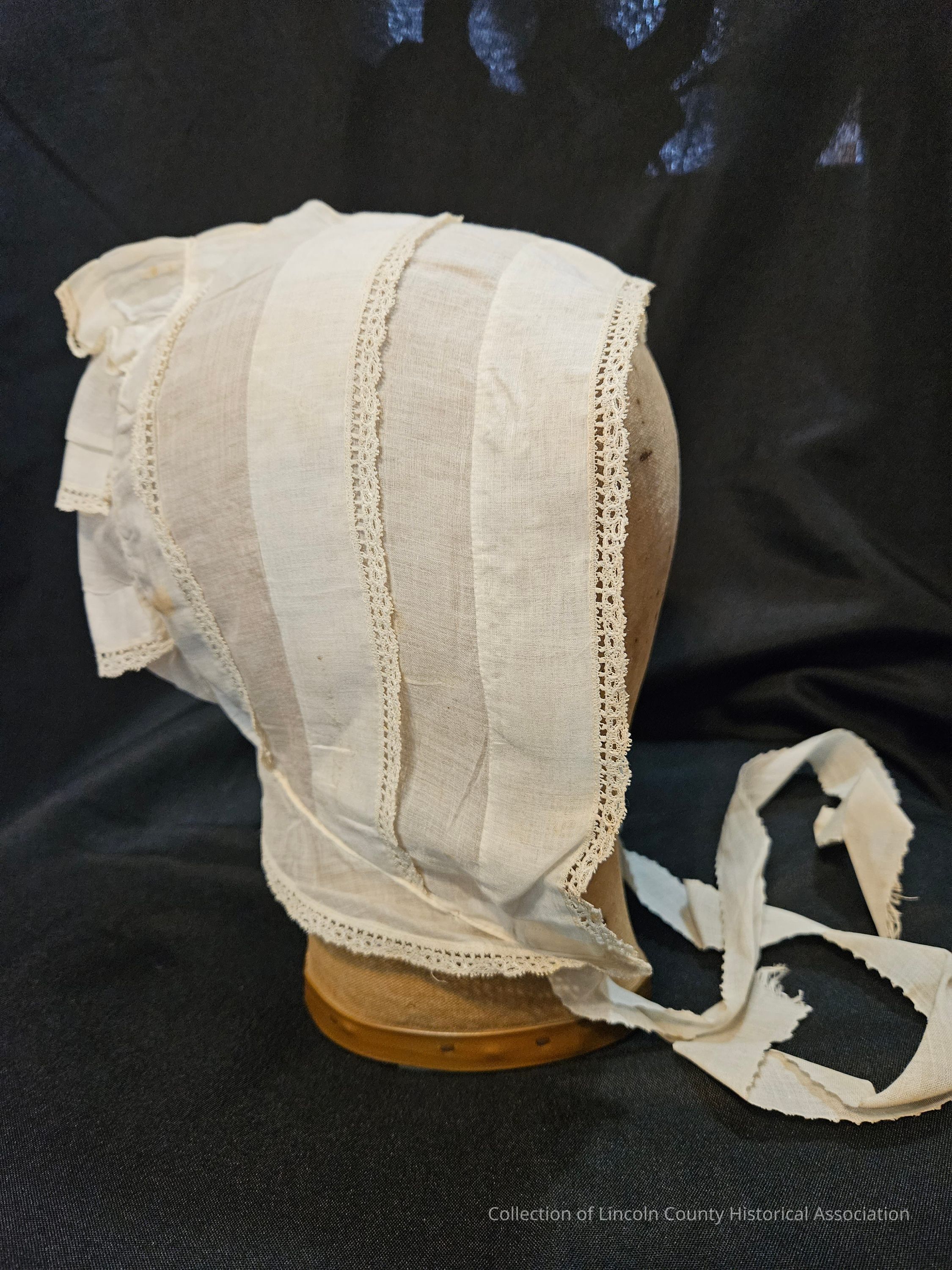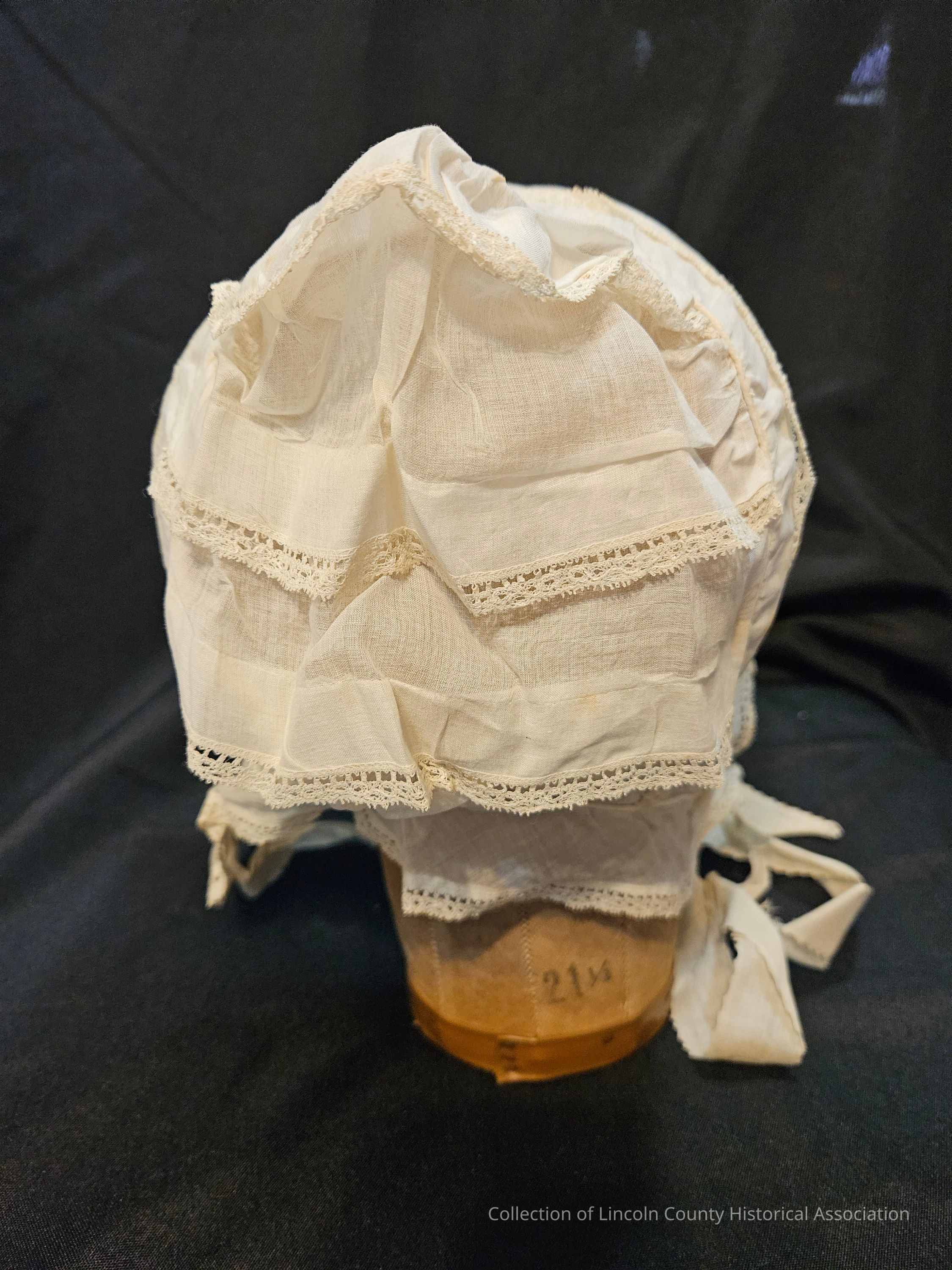 Lace edged cotton organdy cap with scalloped cotton ties. Three lace edged panels at back of the cap and around the top. Piped edges. Faint illegible pencil signature on cap.Clothing/Dress/Costume Details