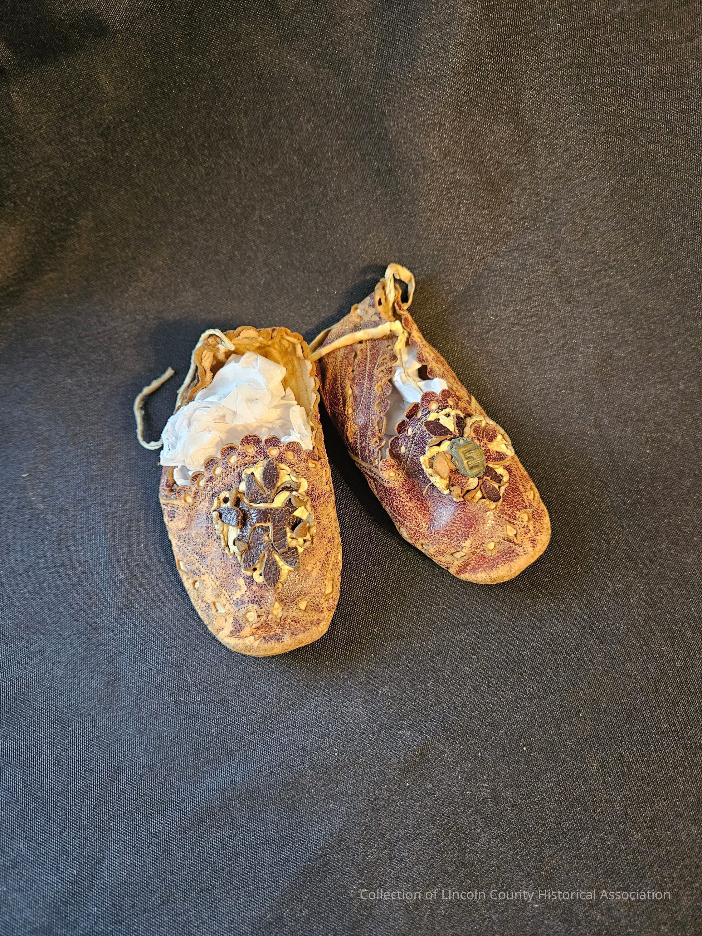 Pair of brown leather shoes with cloth lining. Decorative holes cut in leather along scalloped edges and toe. Flat and soft sole. Leather floral design on front, one shoe has decorative metal button in the middle of flower. Machine sewn. Cardboard in sole.