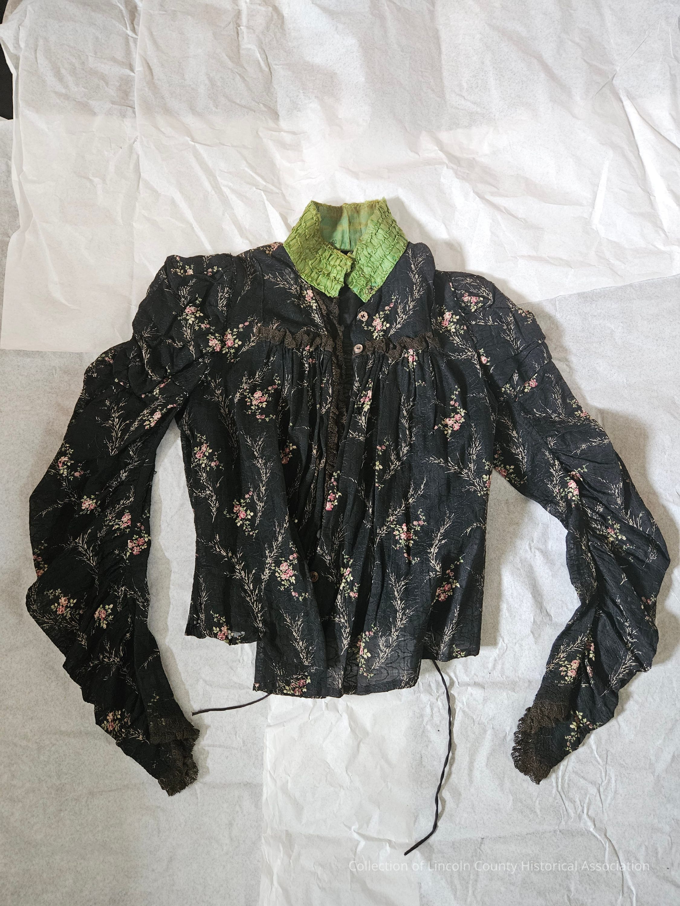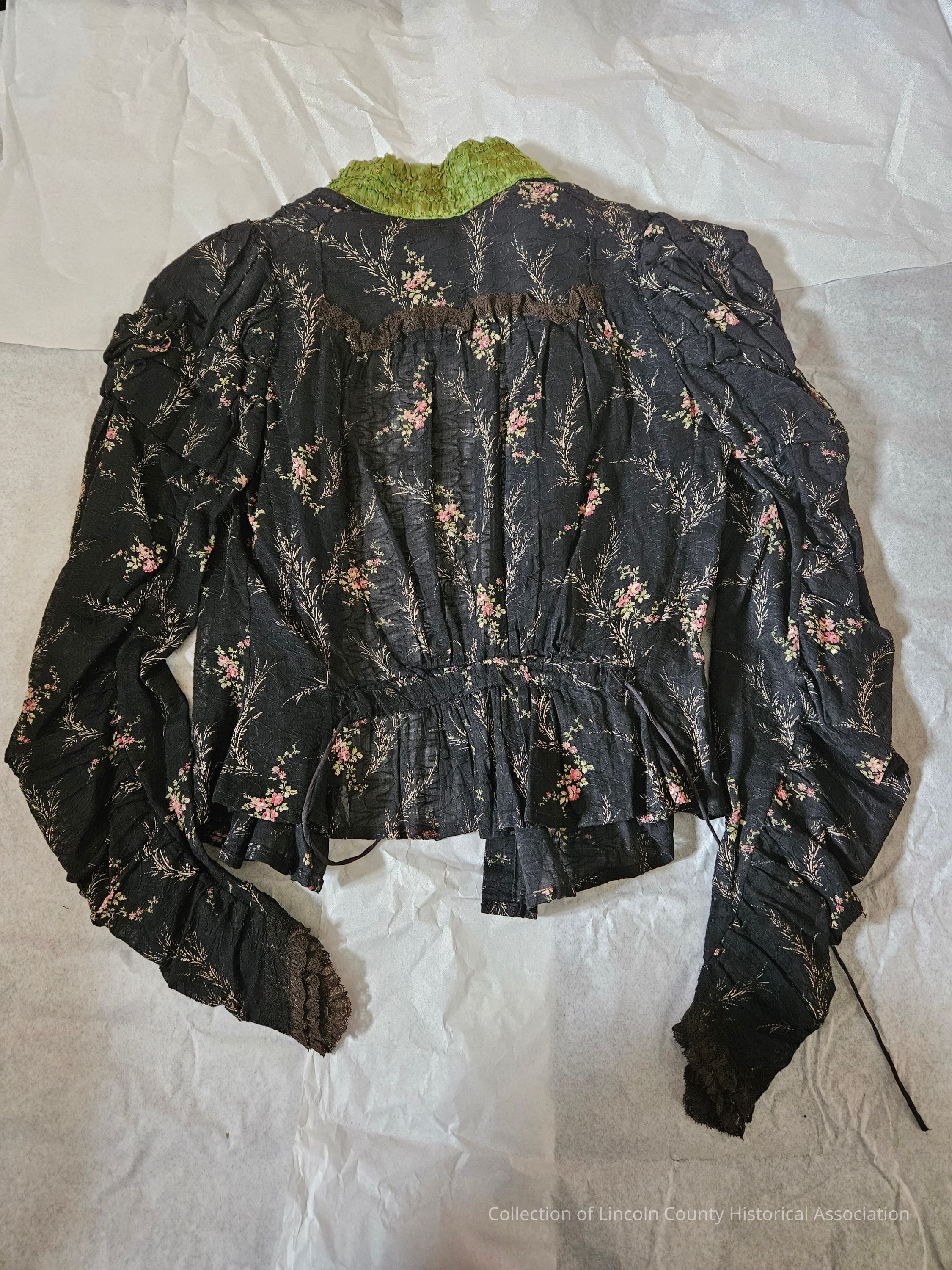 Sheer black bodice with floral designs. Green silk collar. Ruffled lace down front of bodice, front of shoulders, and around cuffs. Pleated at top of sleeves. Gathered at back of waist with adjustable string. Button down front. Machine stitched.Clothing/Dress/Costume Details