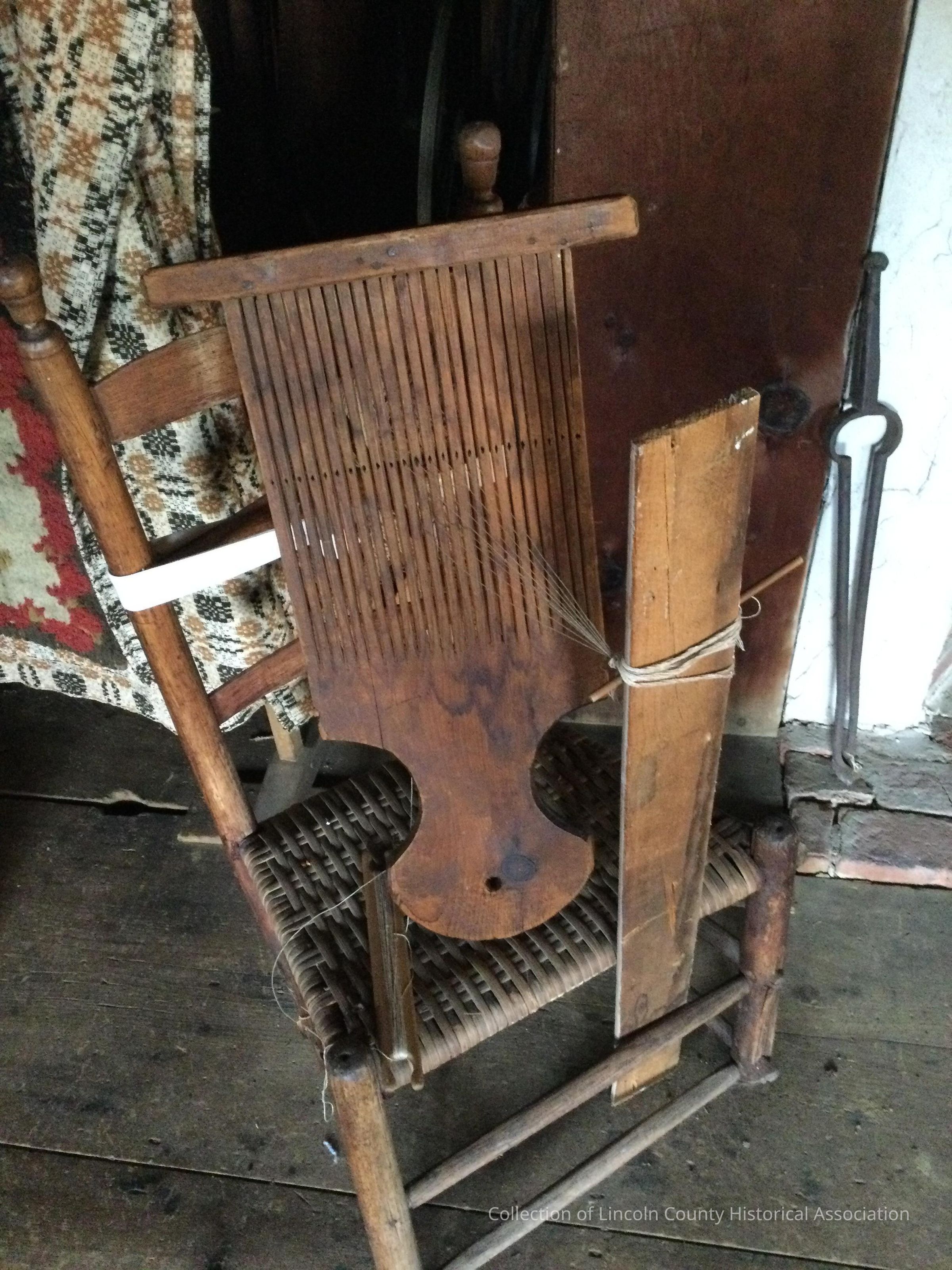 Hand loom. Flat board cut with long comb-like strips. Has a large rounded finial at the top which allows loom to be hung. Is portable and attachable, for example, to a chair back.Made/Created
