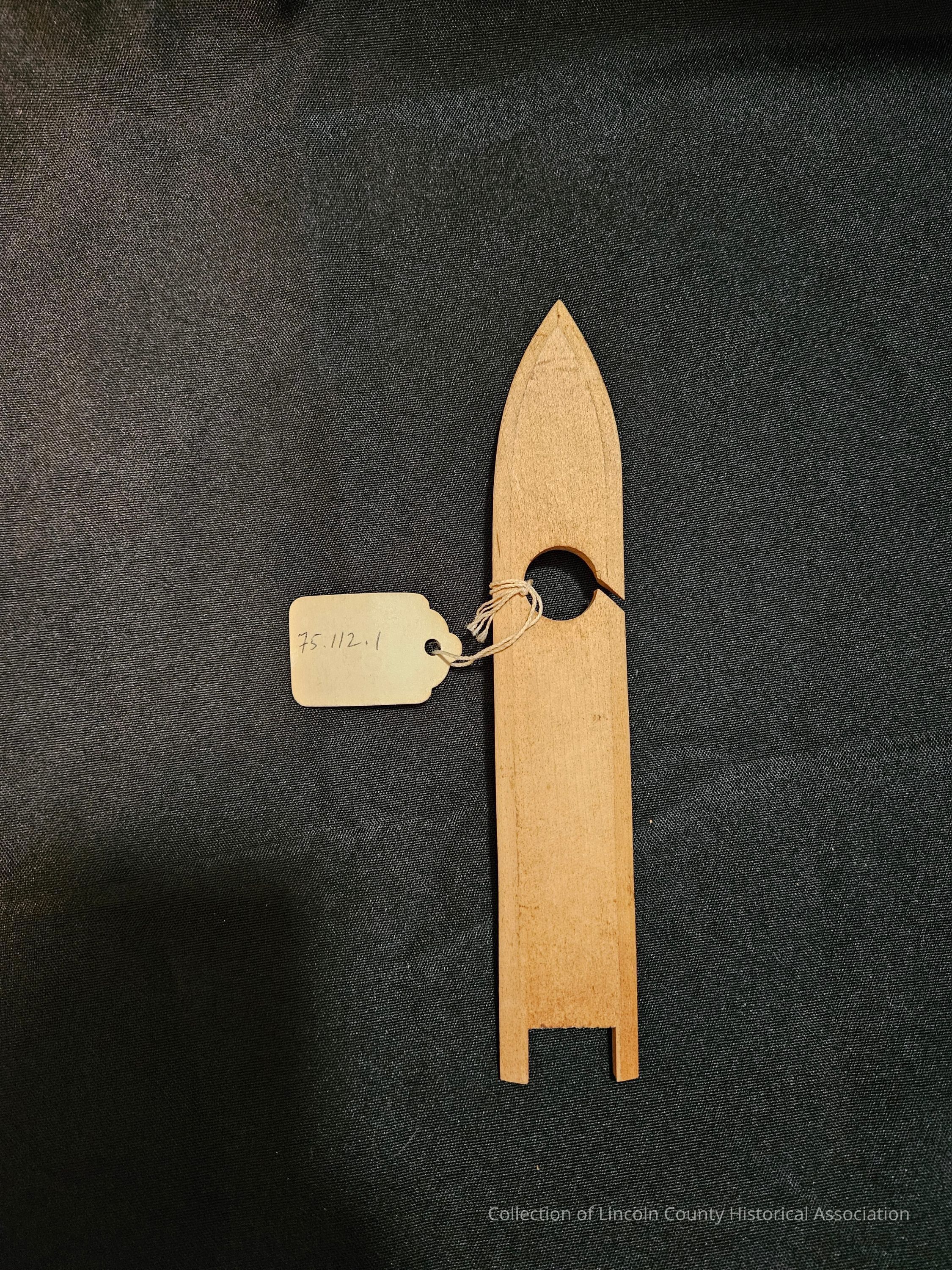 Wooden netting shuttle. Two small wooden legs. Open circle in the center.