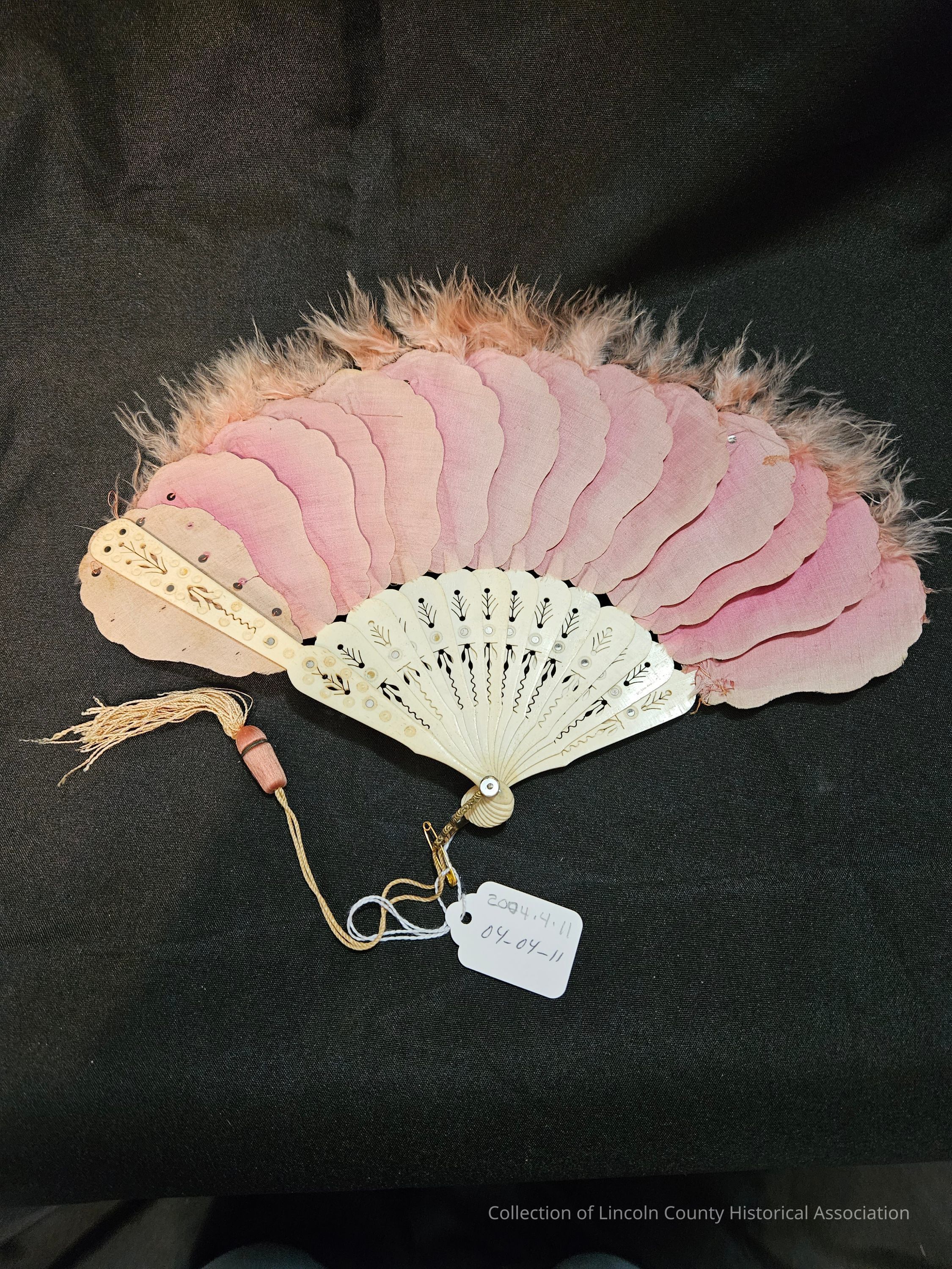 Hand fan with pink silk leaves shaped like feathers. Real pink feathers on top of leaves. Metal sequins on leaves. Carved ivory sticks. Mother of pearl rivet with metal gold handle. Pink tassel hanging off handle. 14 Extant sticks, one missing.