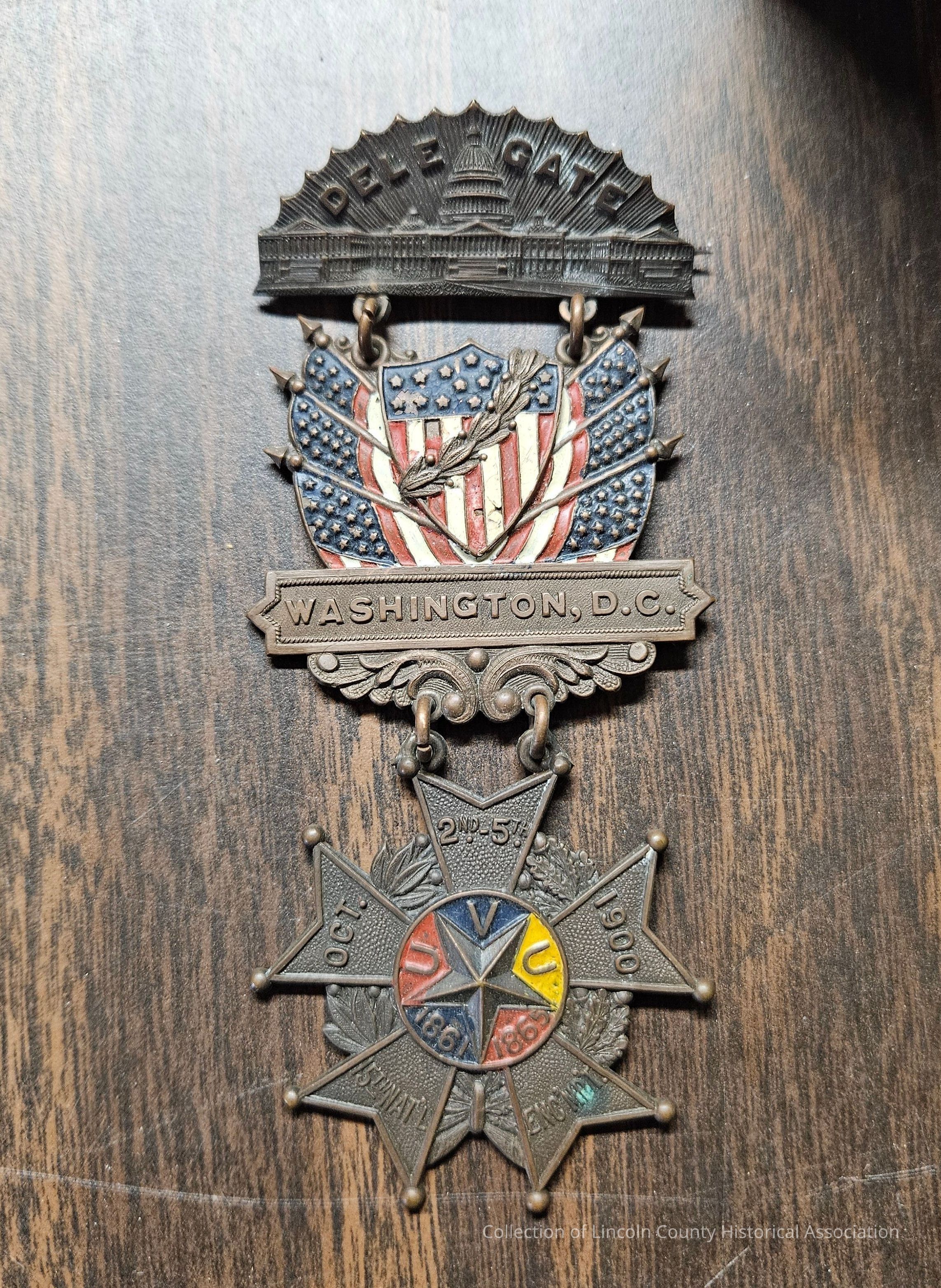 Union Veterans' Union encampment medal. Composed of three linked sections. Top section says "Delegate" and has image of capitol building. Second section says "Washington D.C." and is composed of a central shield with American flag design cover by a wreath. Shield is surrounding by six flags. Third section is star- shaped with date of encampment and years of war. The Union Veterans' Union was a smaller organization similar to the GAR.Made/Created