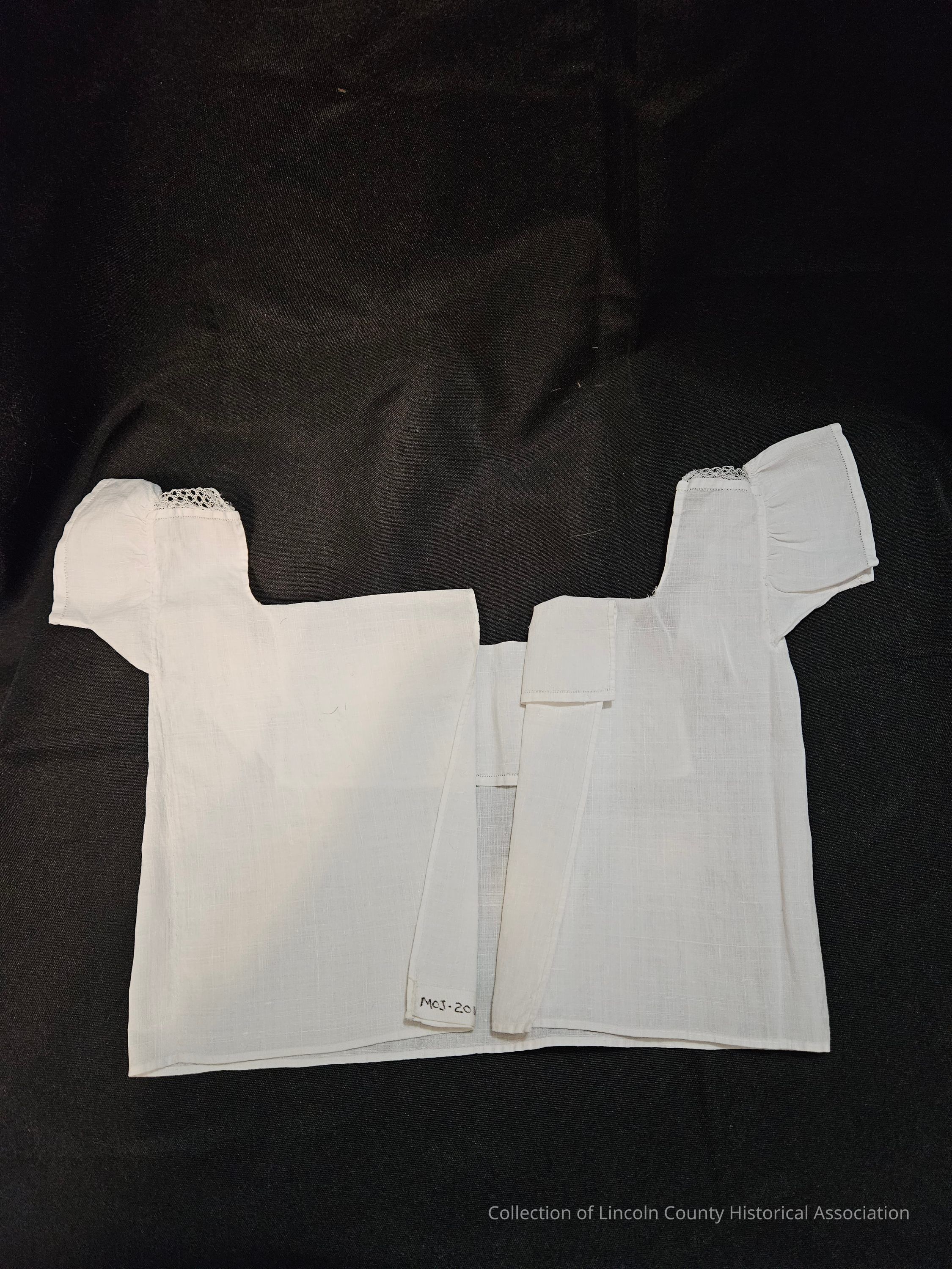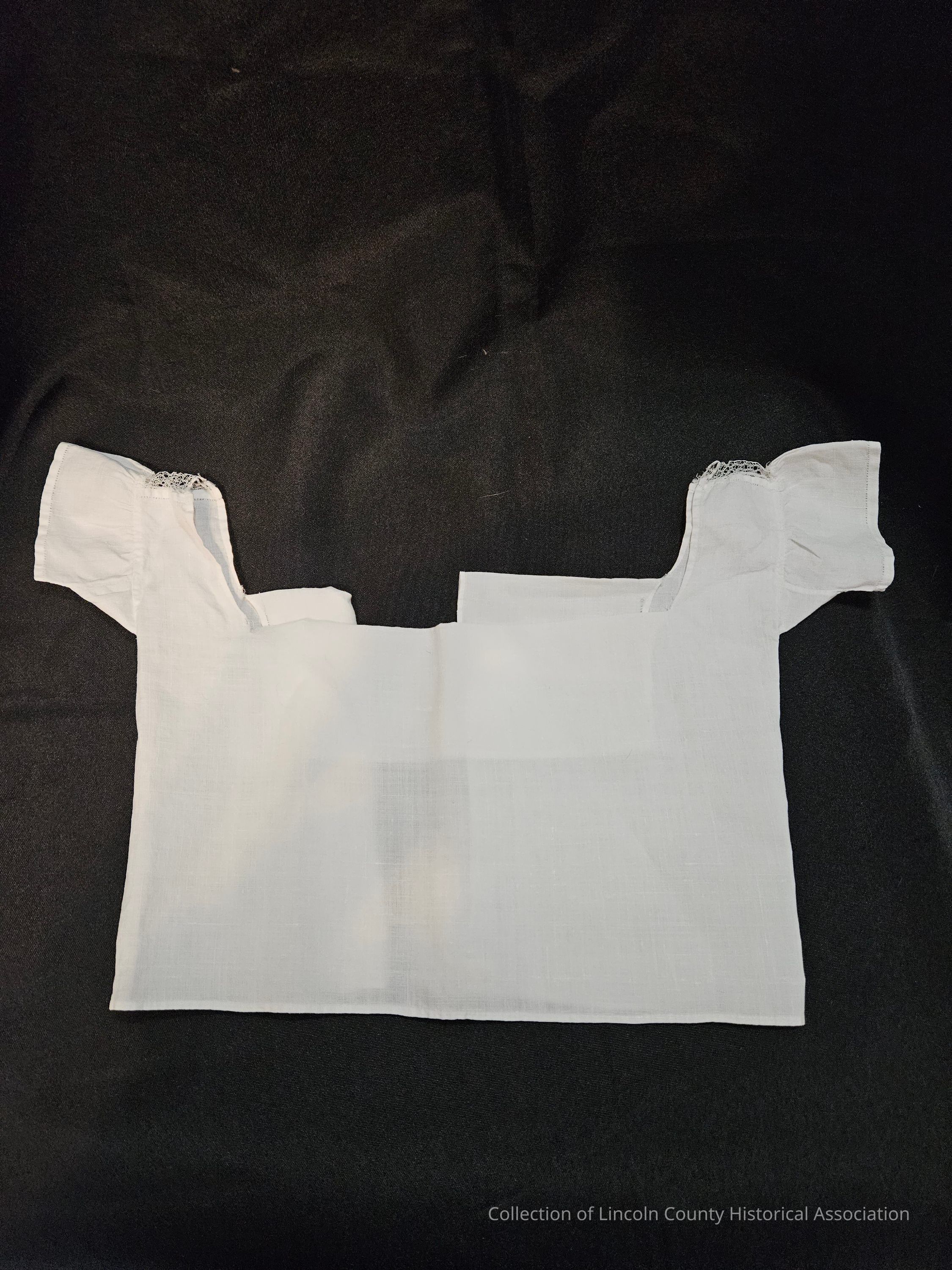 White cotton infant shirt. Lace at the top of shoulders. Gathered around the arms. A folded interior flap in the front and two on the back. Back of shirt is not connected together.Clothing/Dress/Costume Details