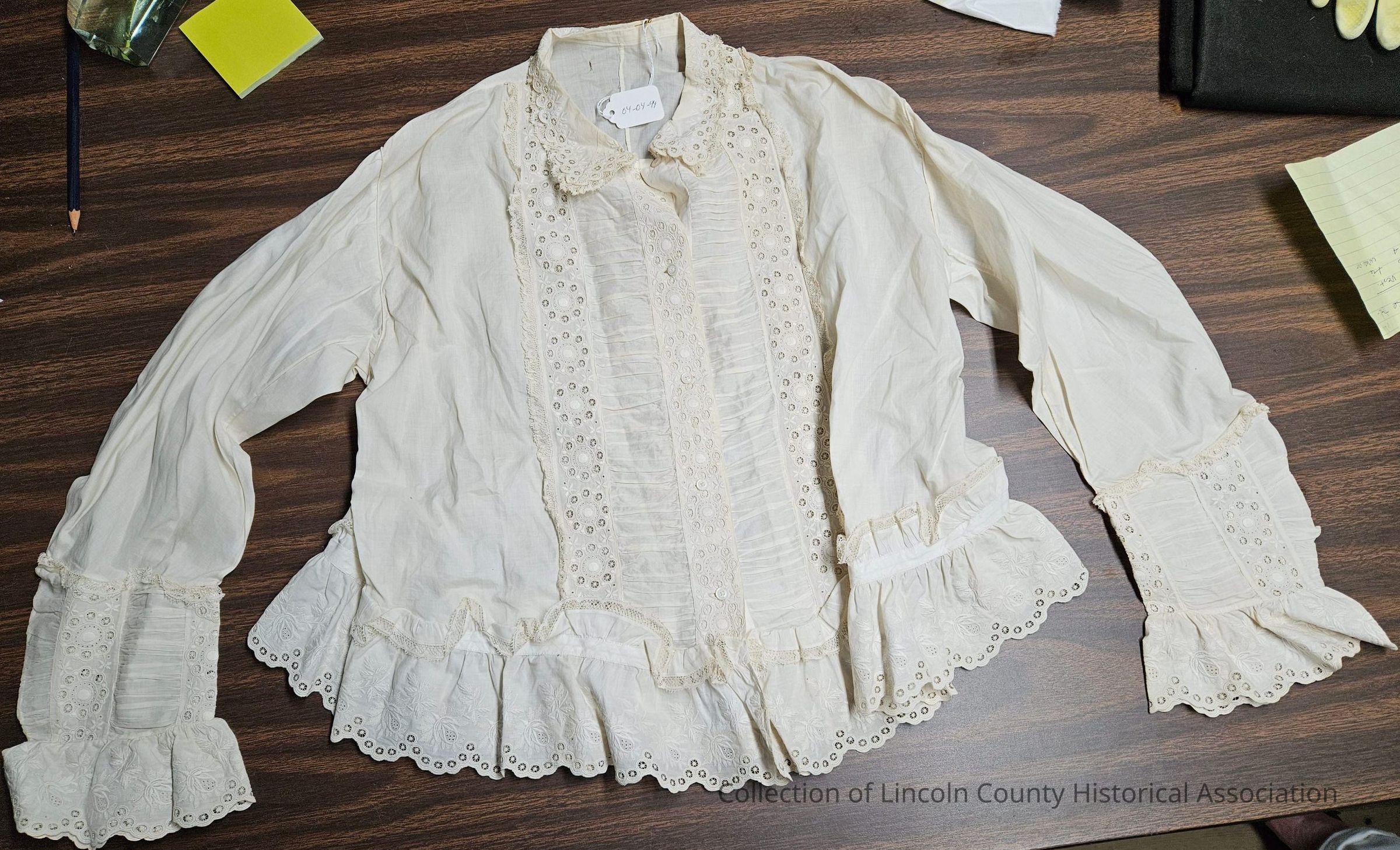 Women's white thin cotton bodice. Piping on sleeves and seams. Peter pan collar. Scalloped at end of arms and bottom of bodice. All hand stitched, some pieces store bought.Clothing/Dress/Costume Details