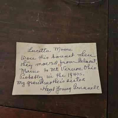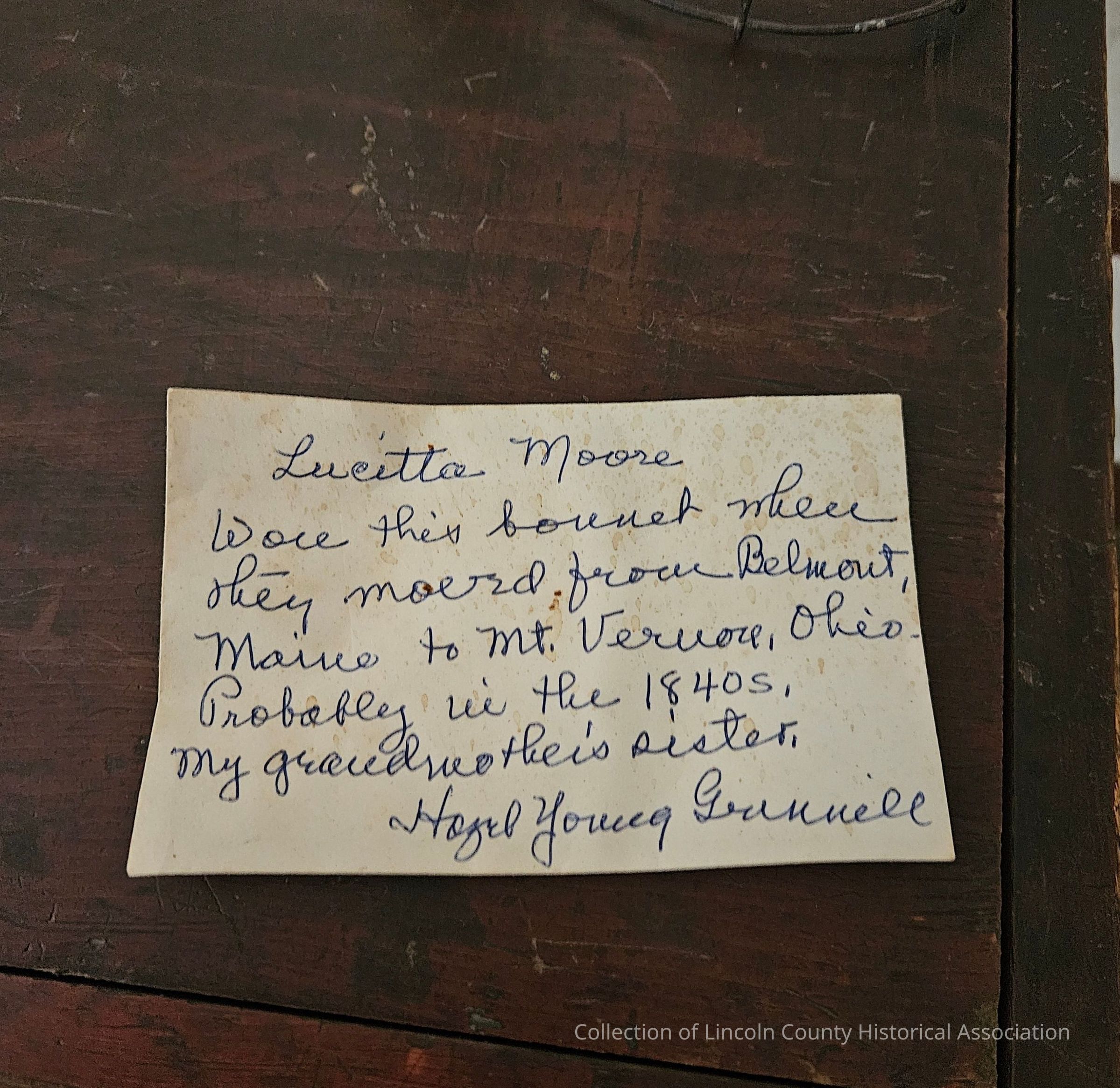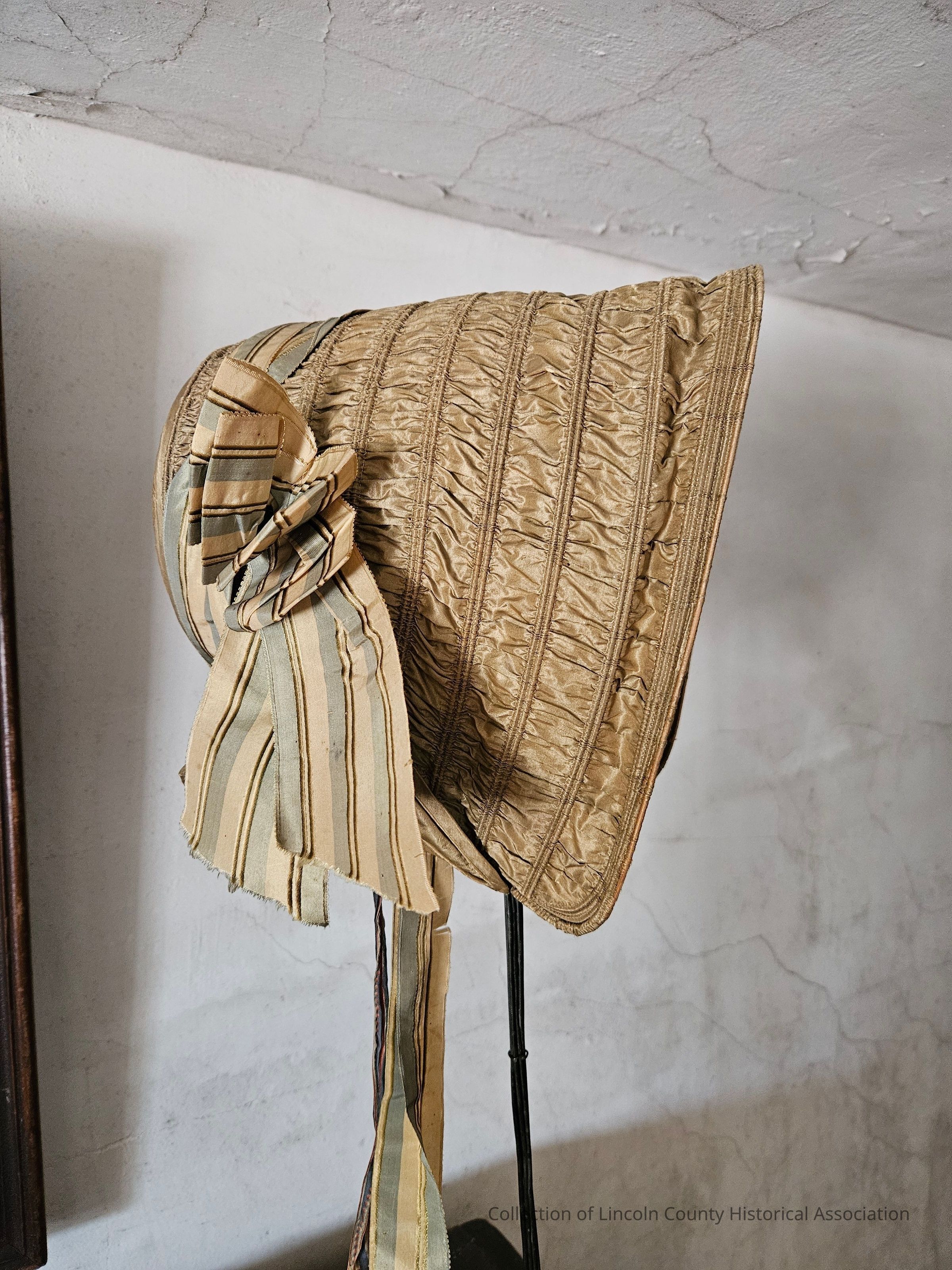 Tan silk bonnet. Arranged in gathered rows. Blue, brown, and tan ribbon around back of head. Worn by Lucitta Moore in the 1840s on her trip from Belmont, Maine to Mt. Vernon, Ohio.Clothing/Dress/Costume Details