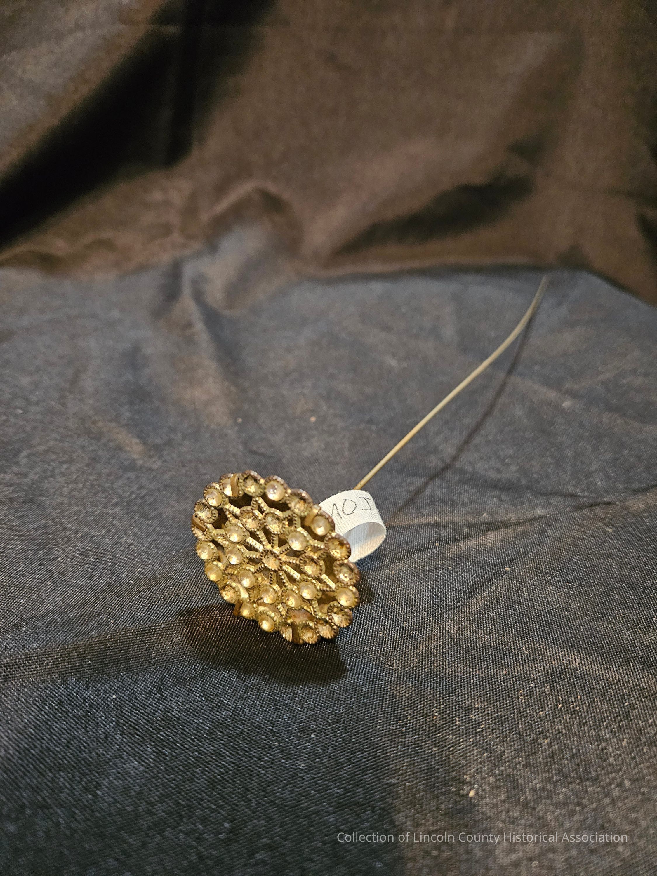 Women's hat pin. Flat head with floral design and clear paste diamonds. Concave metal base.