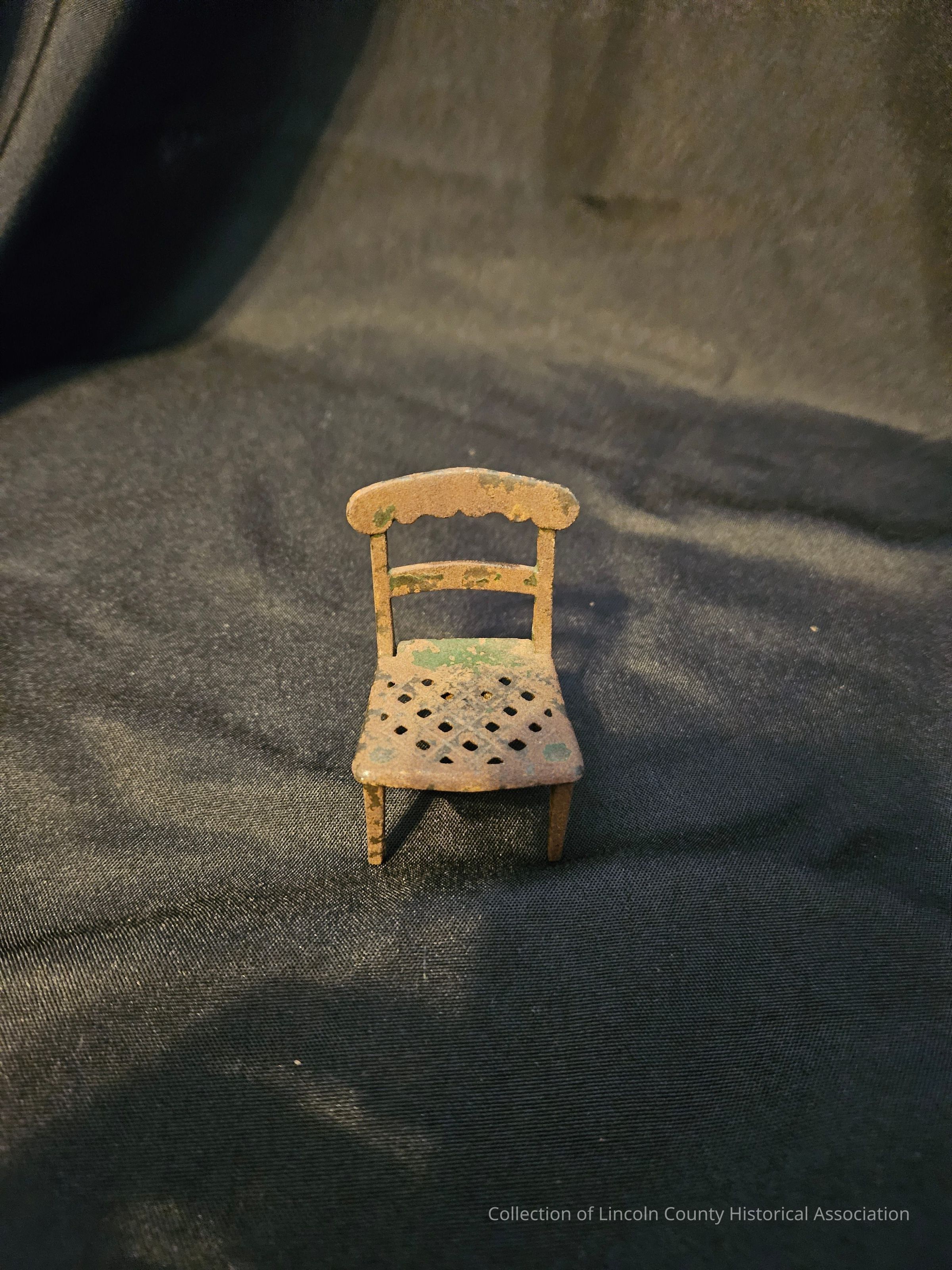 Metal doll chair. Straight-backed chair with "caned" seat. Two piece construction, back and rear legs rivetted to seat and front legs. Originally painted green but paint has worn.Made/Created