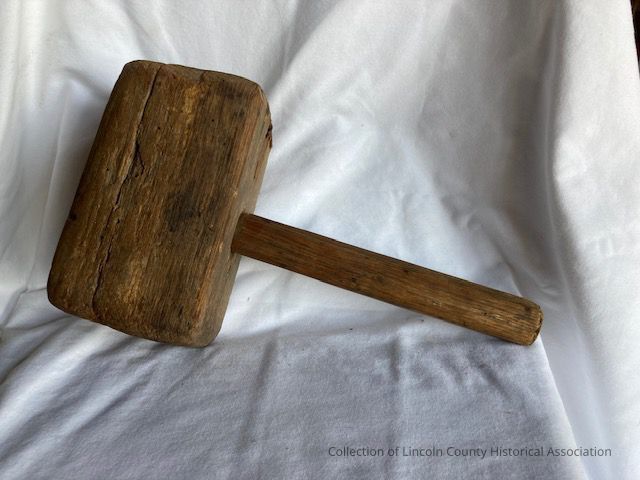 Wooden mallet with a plain, square spruce head and with a hickory handle that goes entirely through the head and is wedged. Most often used to make trunnels (tree nails).