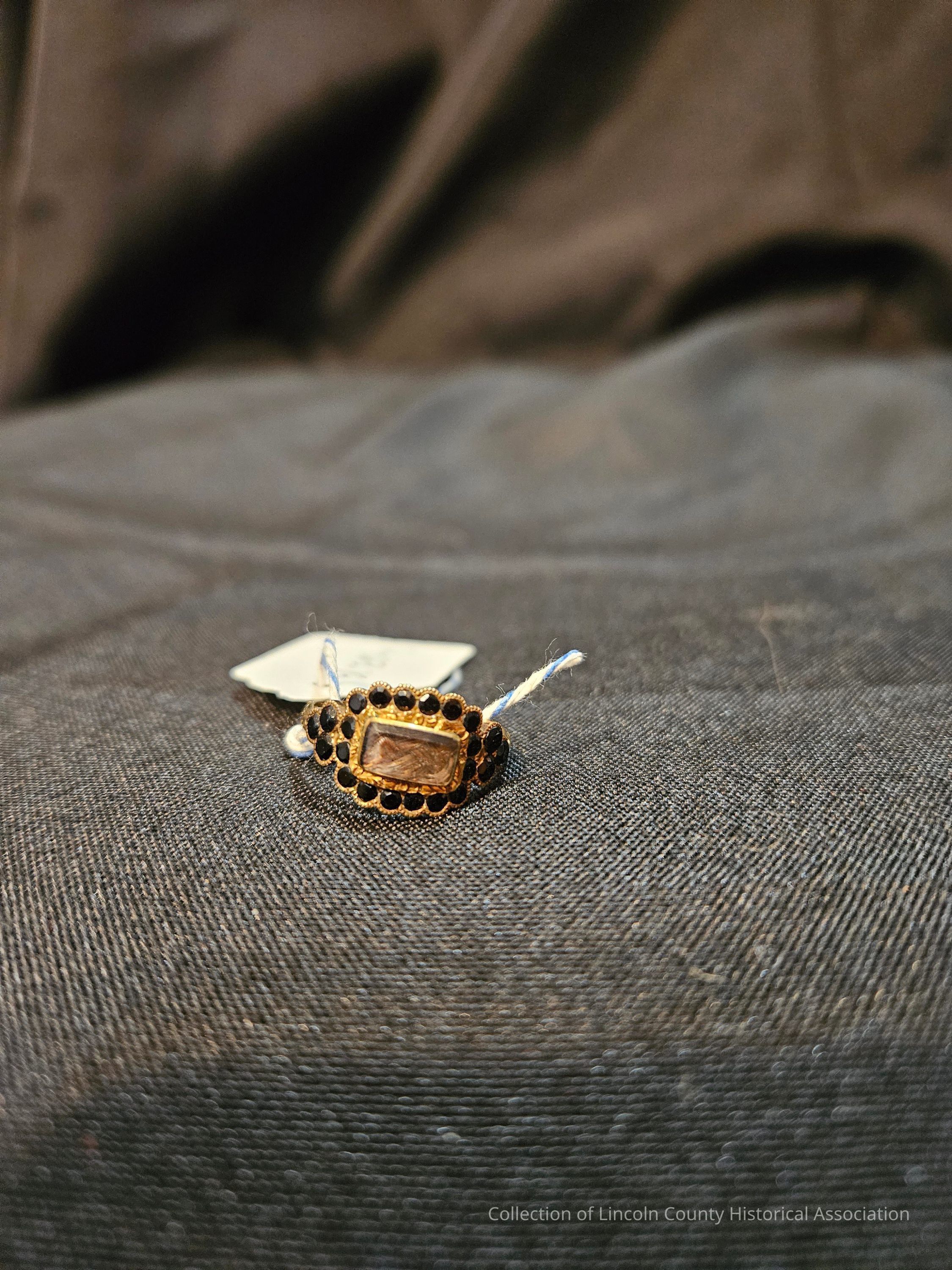 Gold ring with black circular gems surrounding a clear rectangular glass window with a lock of braided hair behind it. Engraving on inside.Mark, Engraving or Stamp