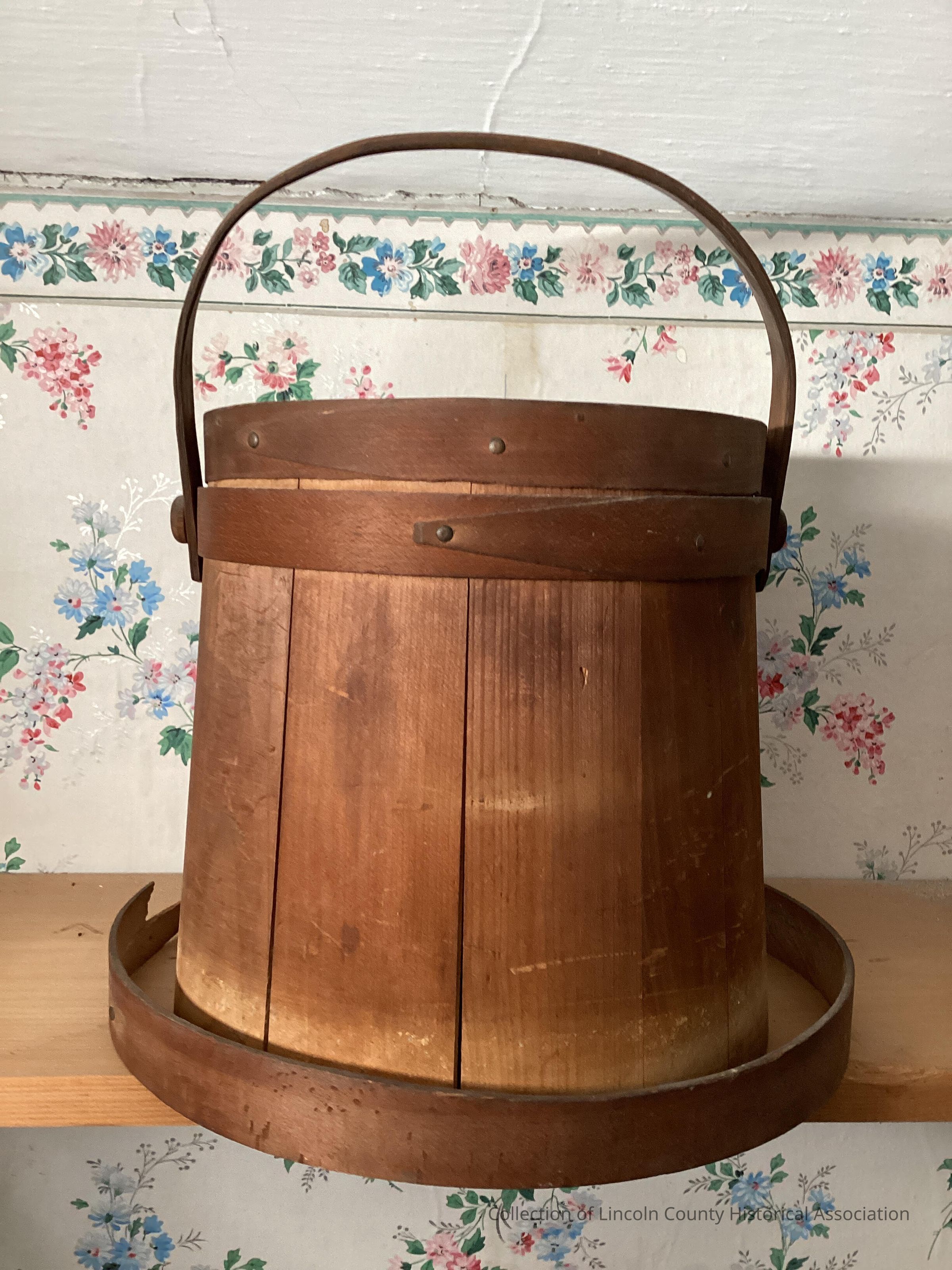 Wooden firkin with wooden strapping and a wooden handle. Retains its wooden top.