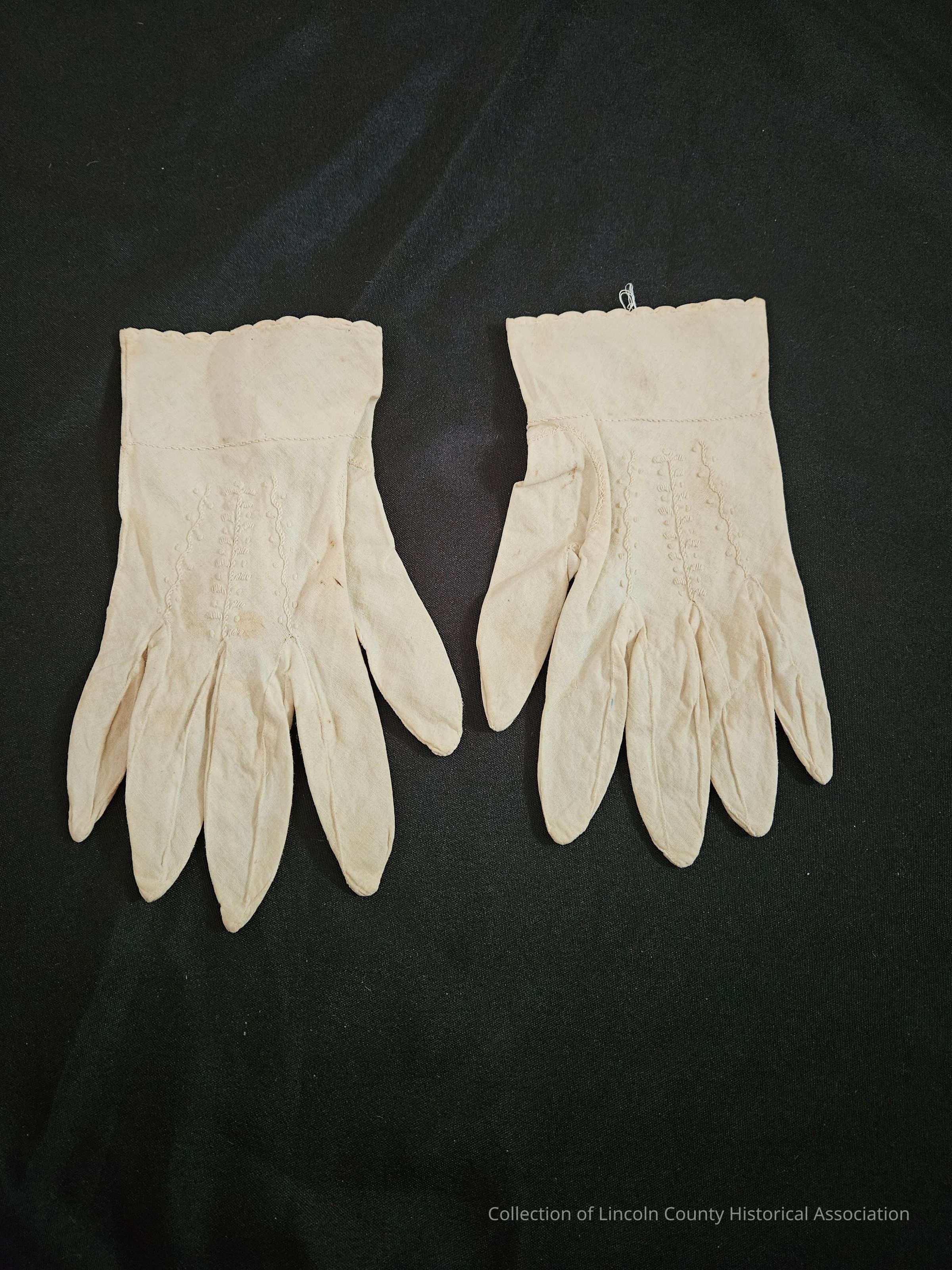 White cotton gloves with three lines of embroidery on top of hand. Scalloped cuffs.Clothing/Dress/Costume Details