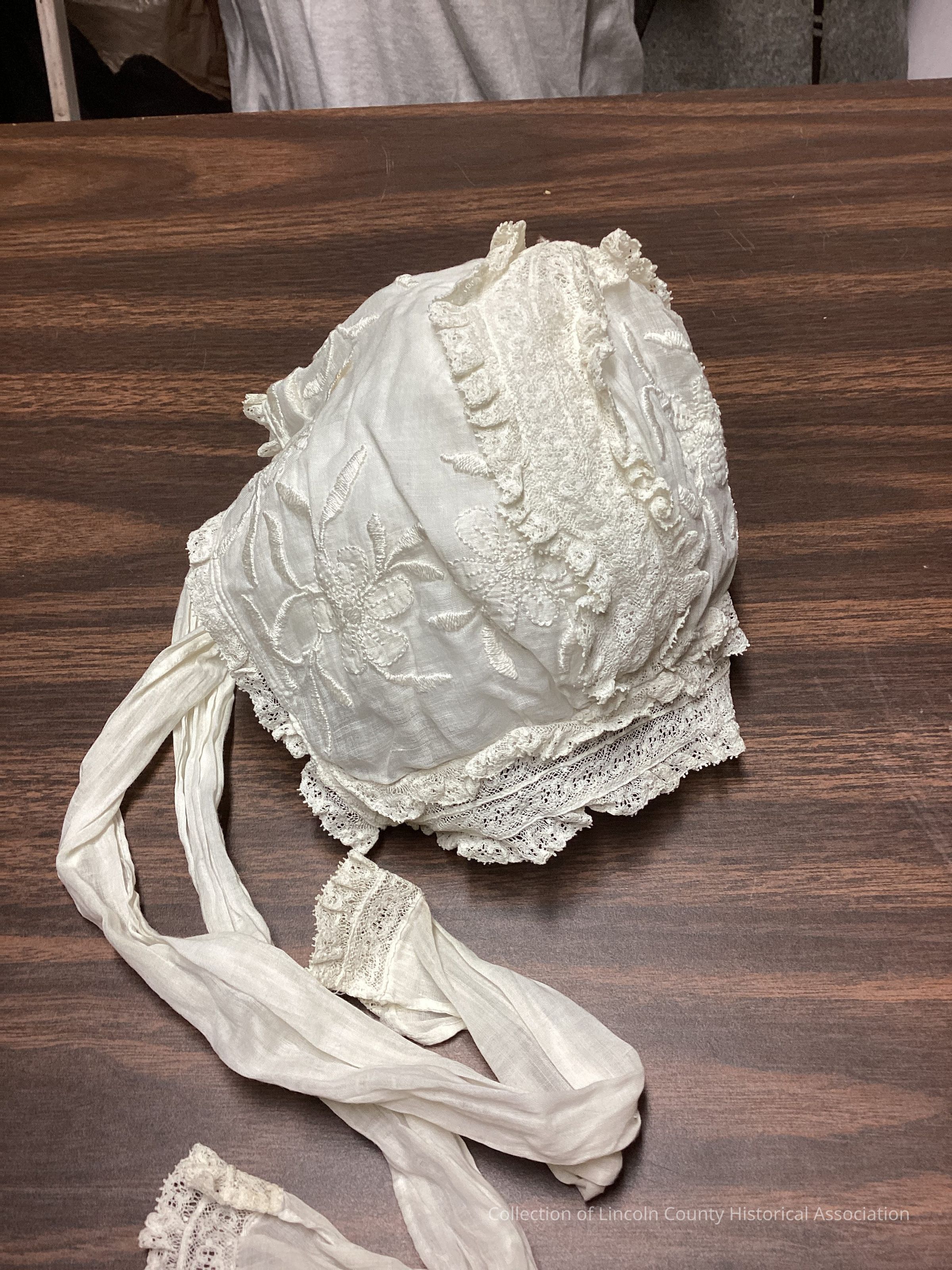White cotton child's cap. Embroidered flowers with lace ruffle around back of head. Lace trim around face and neck and at bottom of ties. Two long cotton ties.