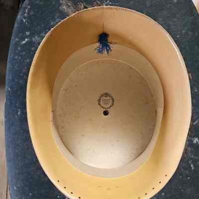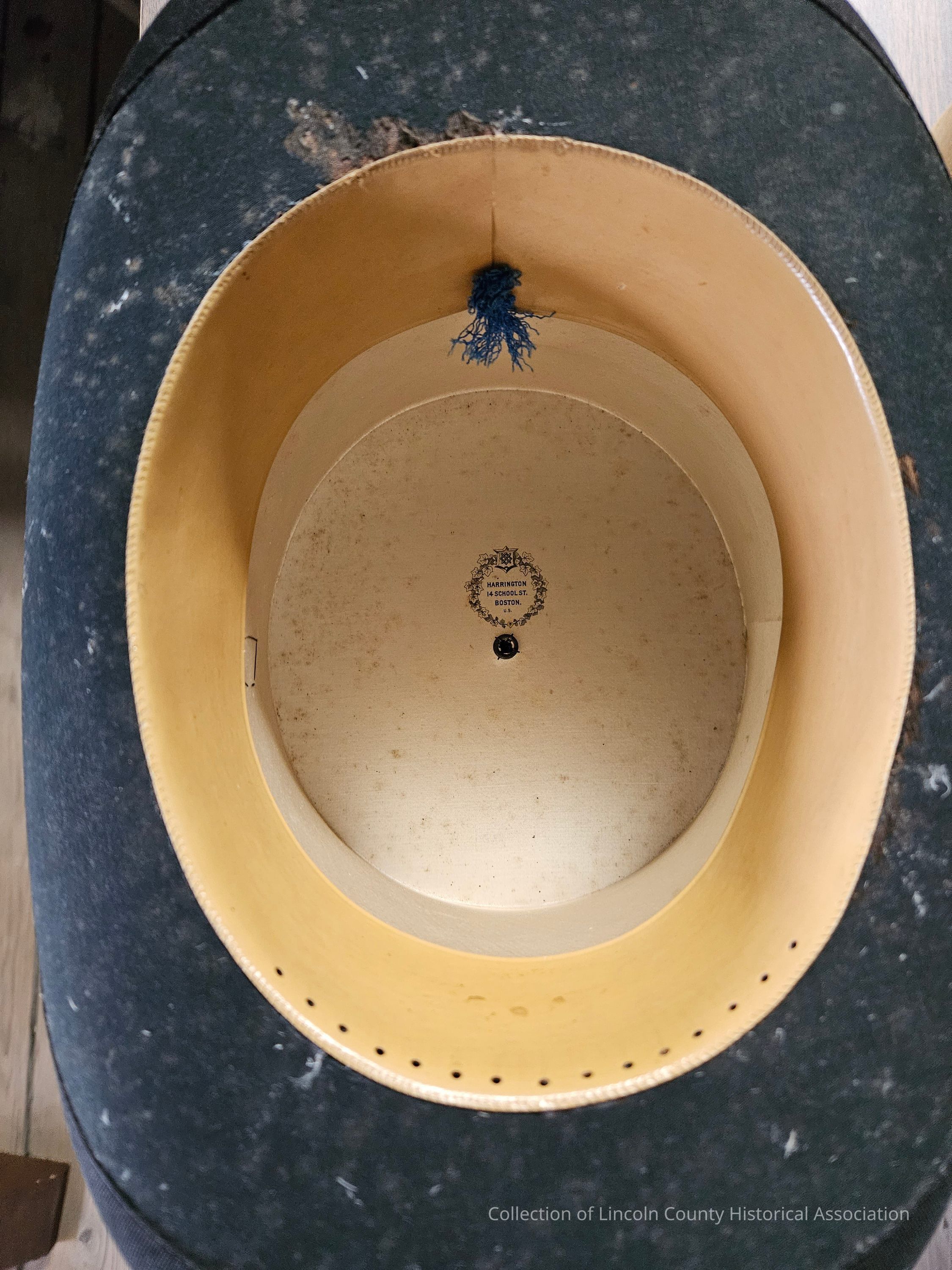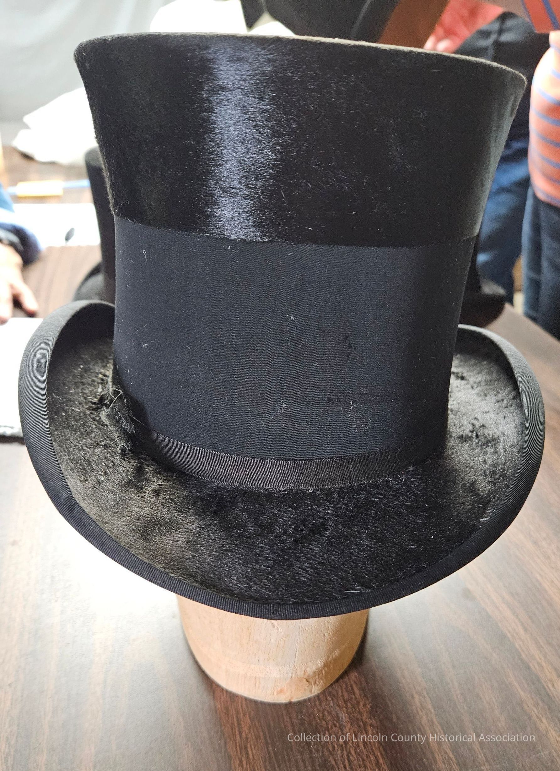 Black beaver fur top hat. Wide black ribbon around base. Curled up sides. Cream interior.