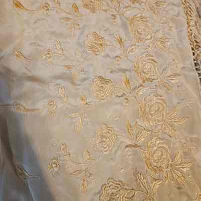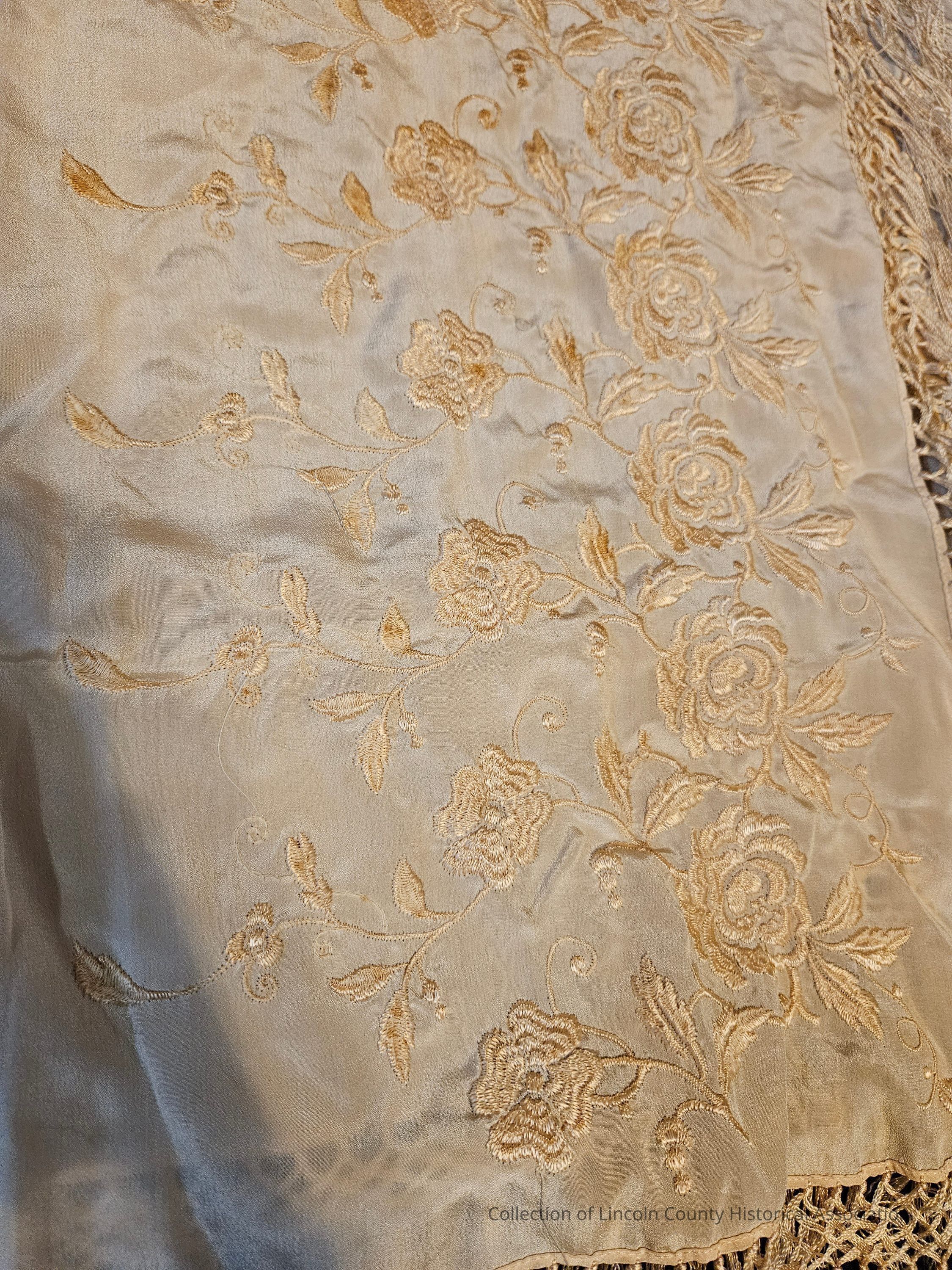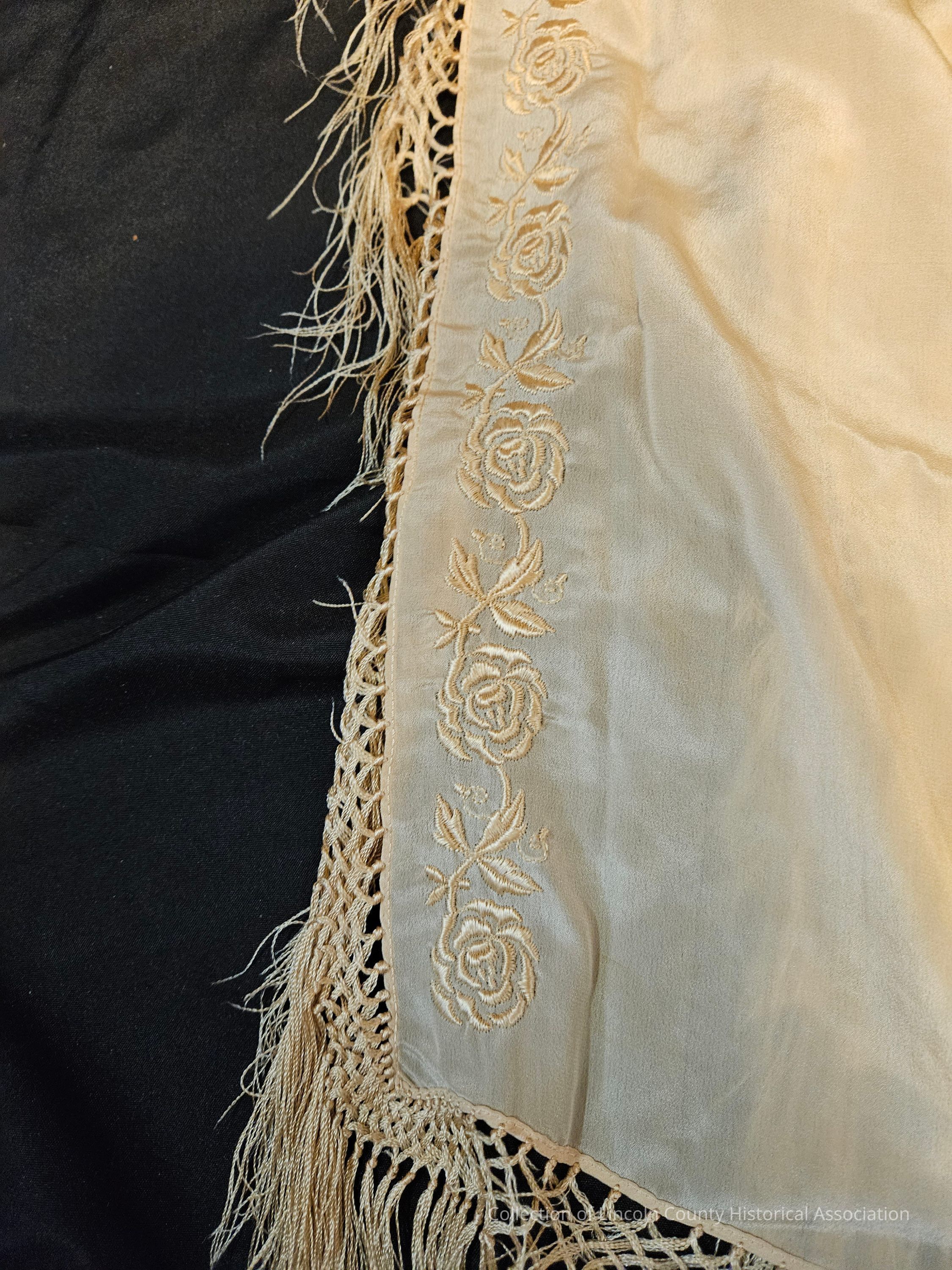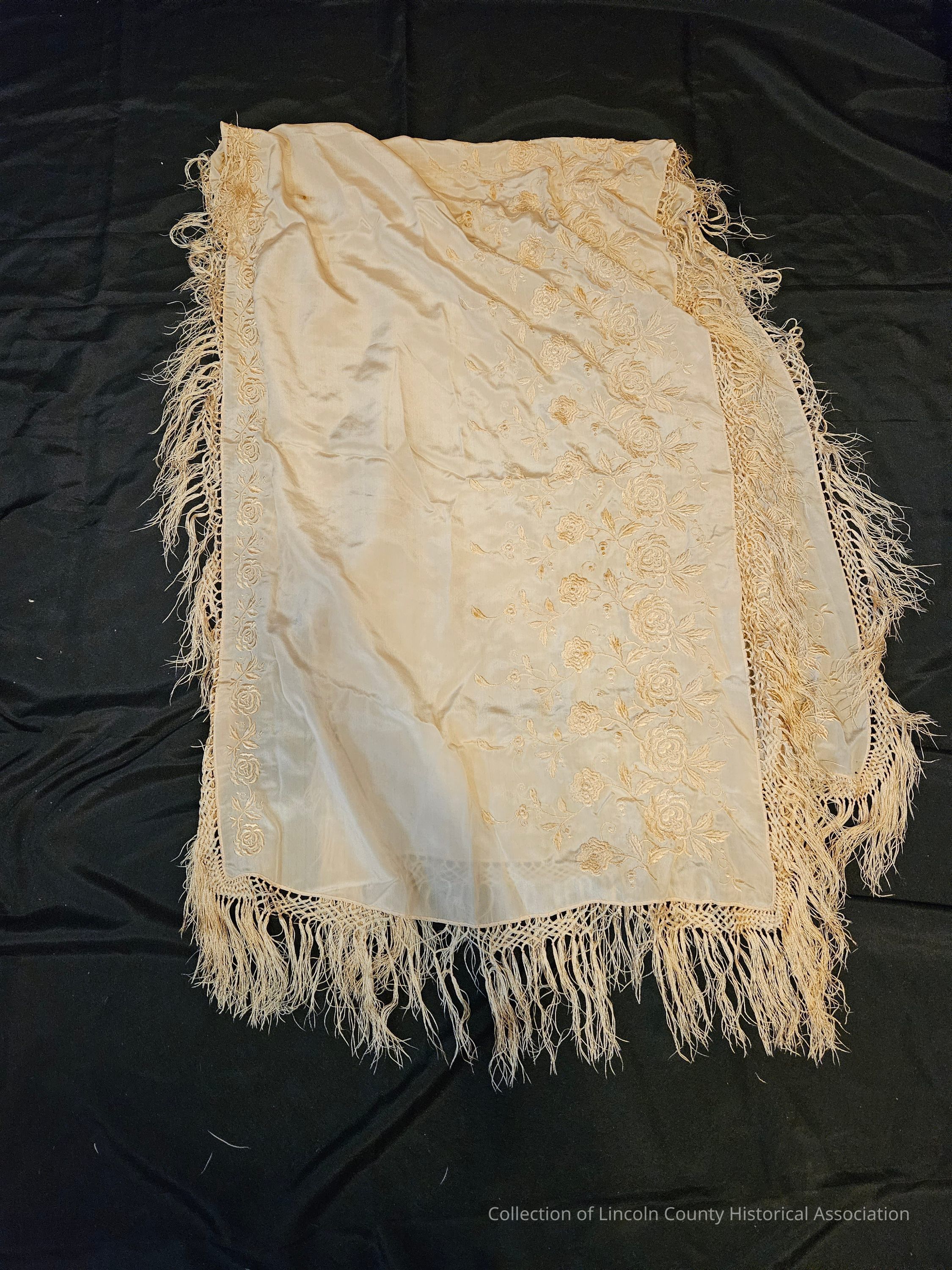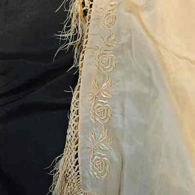 Cream silk shawl with embroidered floral design. One side has a single row of embroidered flowers while the other has a more elaborate floral design. Long and rectangular in shape. Fringe around edges.Clothing/Dress/Costume Details
