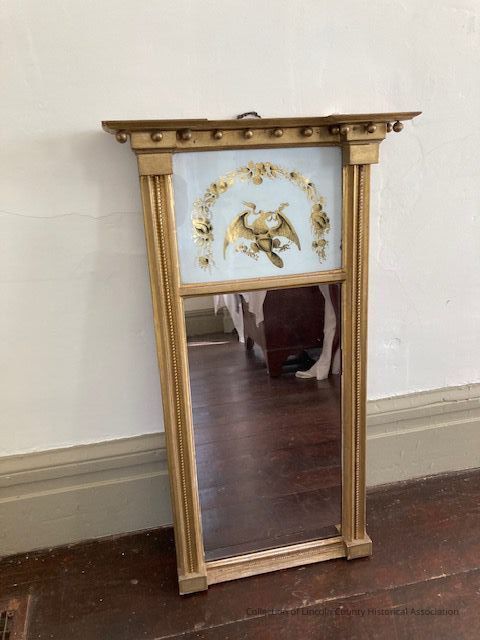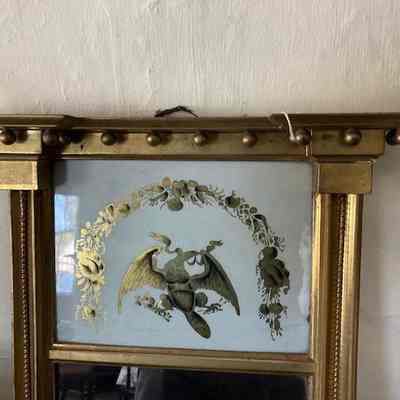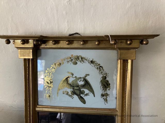 Federal period rectangular mirror with an eglomise panel representing an eagle with outstretched wings. Cornice has stepped projecting corners and the entire cornice is decorated with 14 gilded balls attached to its continuous coved molding. Mirror is backed by a spruce board to protect the glass. The entire front surface of the mirror frame has been coated with plaster and gilded in gold leaf. A spiral patterned band is inset at center of sides and bottom.