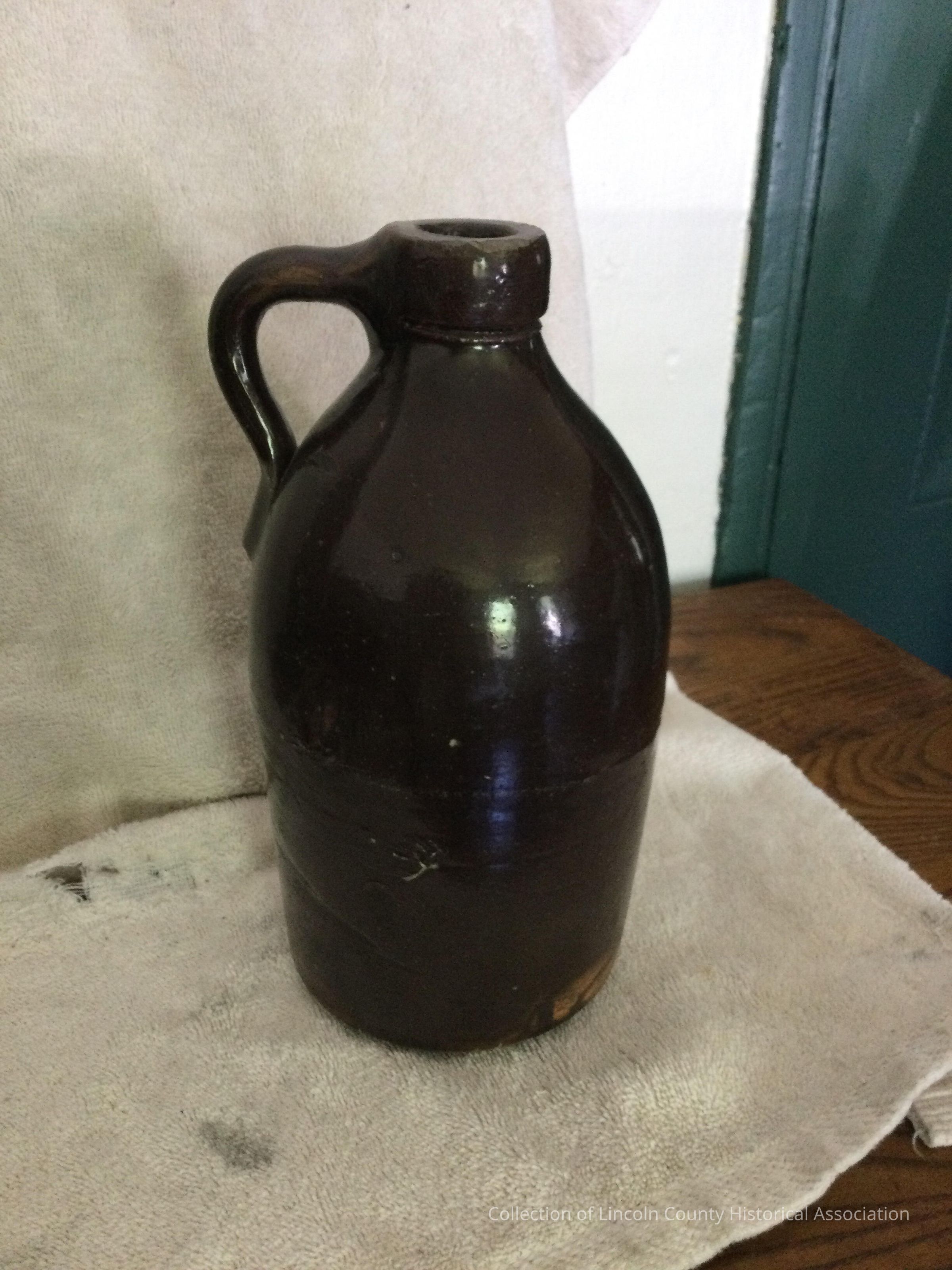 Ceramic jug with a single looped handle. Exterior coated with a brown, metallic glaze and with distinct exterior throwing marks. Bottom has concentric, non-parallel, and off center stiples.Made/Created