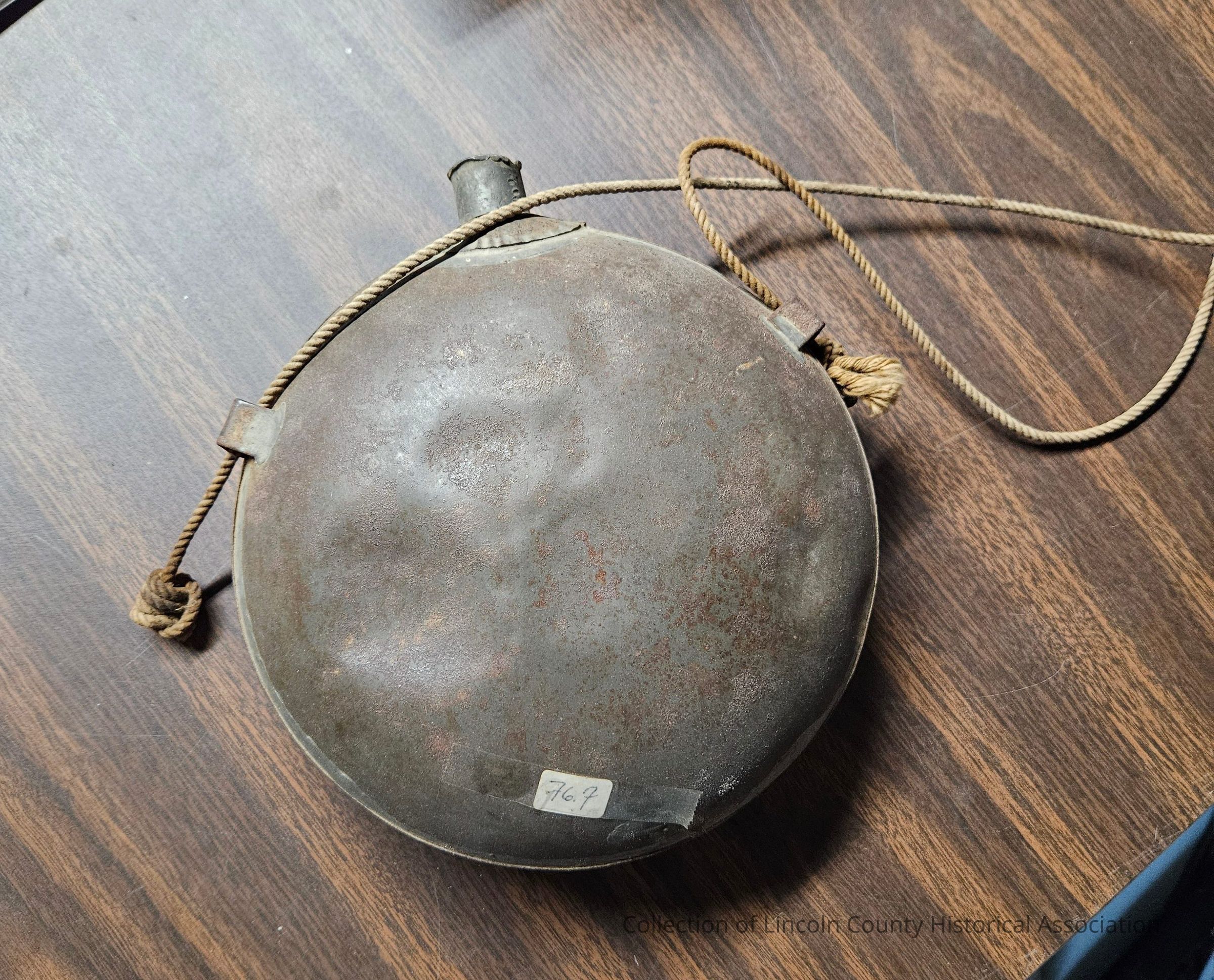 Circular metal canteen with square loops to secure cord strap. Made of tin. 1858 model. Pewter mouthpiece.