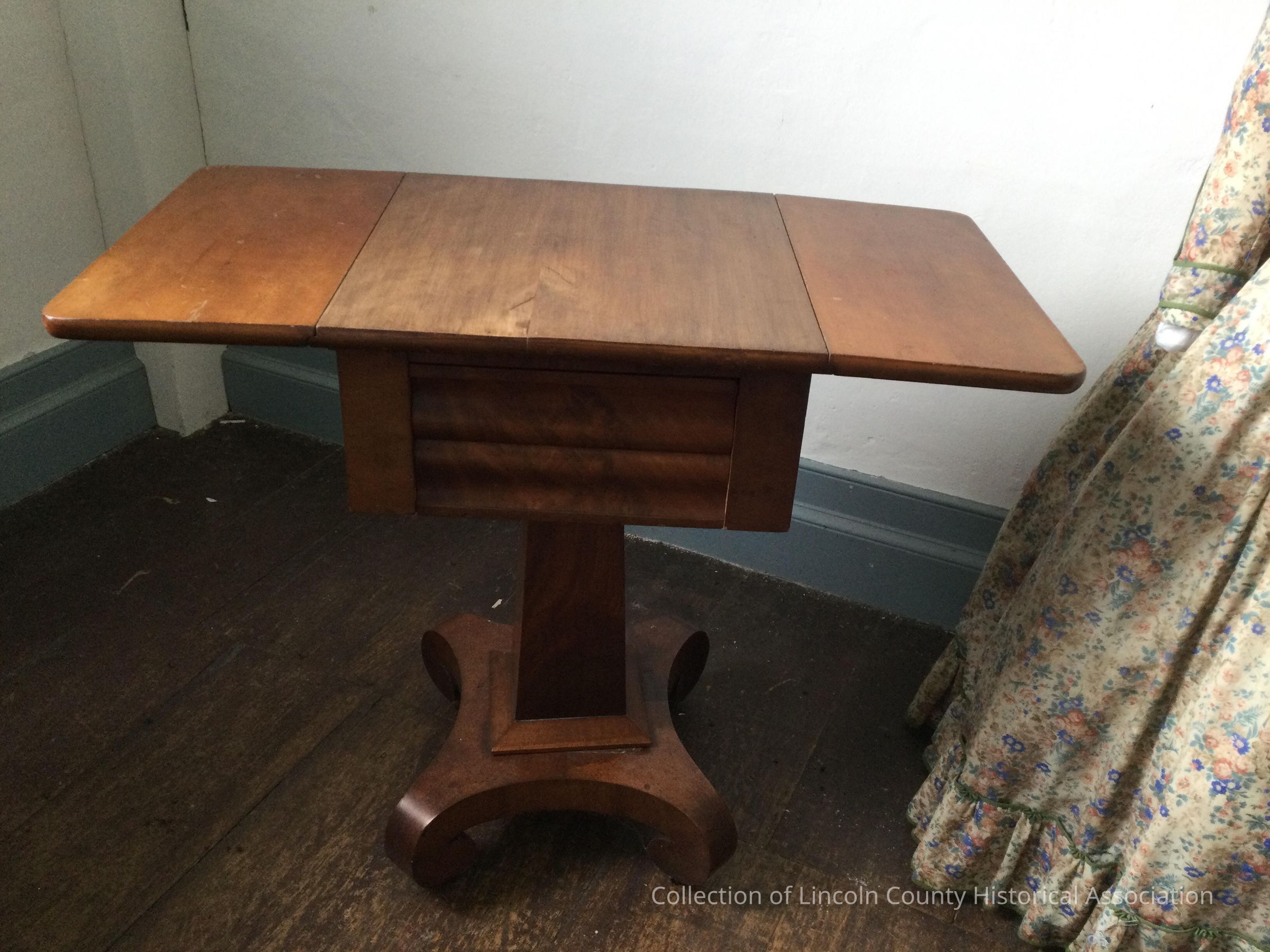 Lady's sewing table in the Empire style. Mahogany top with two leaves and butterfly leaf supports. One drawer the front of which is mahogany veneer on pine. Table is set into a graduated squire plinth set onto an Empire style base with four scrolled feet.