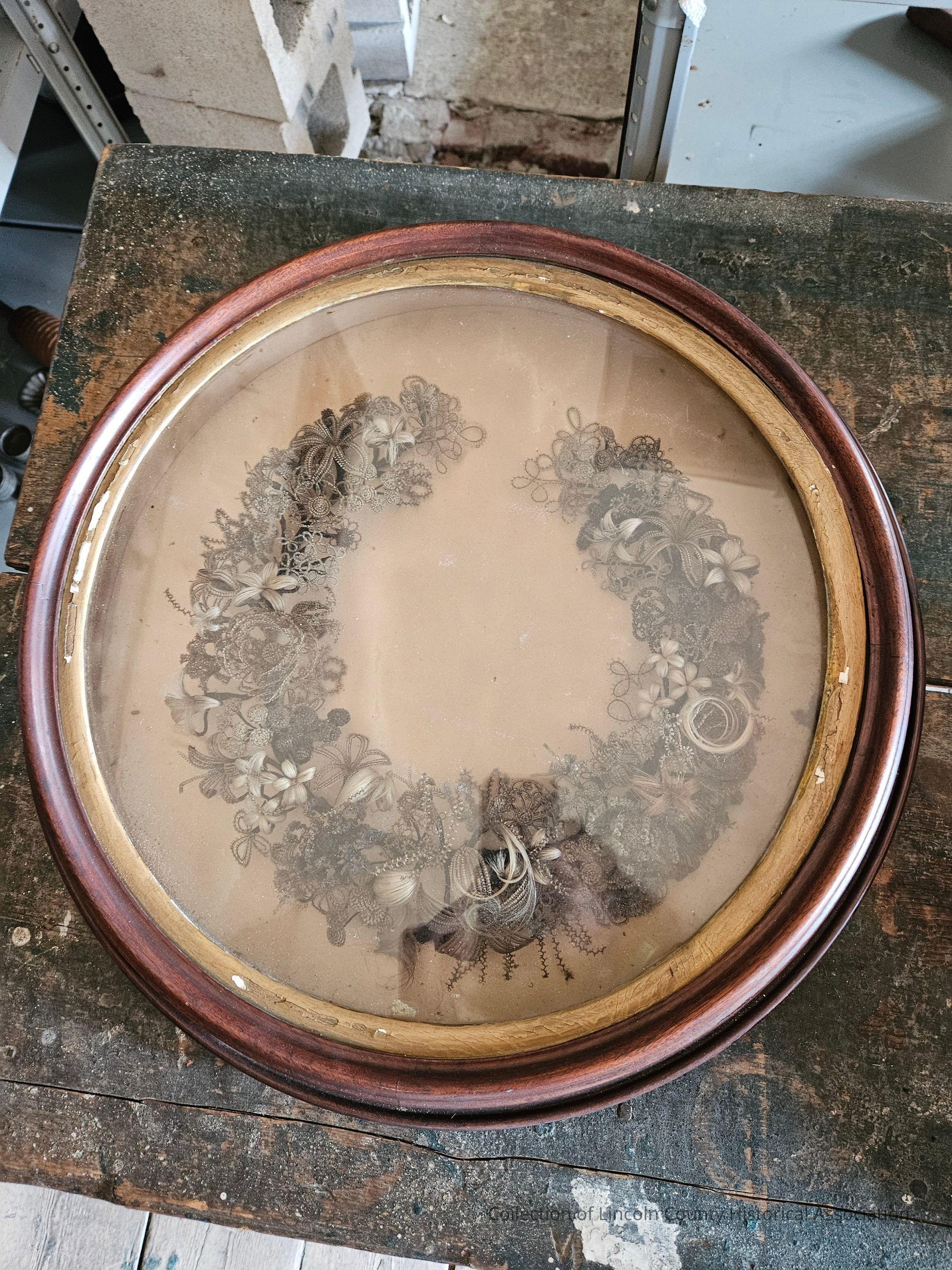 Hair wreath in wooden frame. Circular frame with wreath of flowers and leaves in semi-circle shape. Made of blonde, brown, and red hair.Made/Created