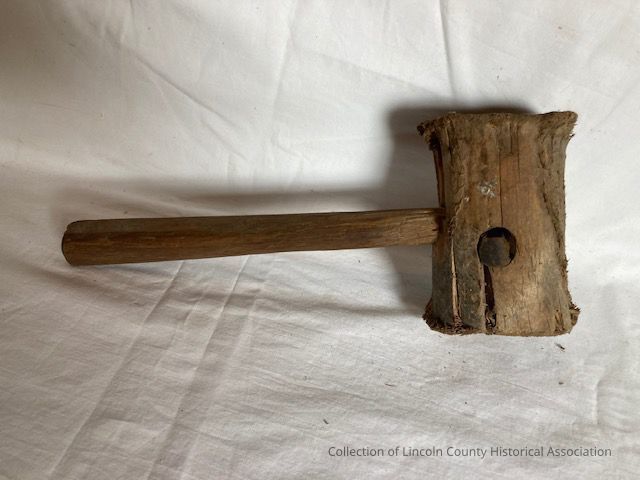 Wooden handle, rounded head mallet. Handle inserts in middle of head. 4 holes at 2 inch intervals around middle of head.Dimensions
