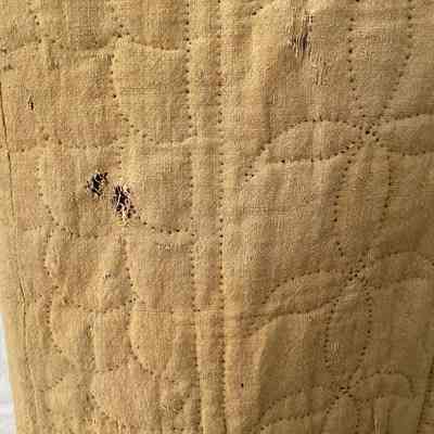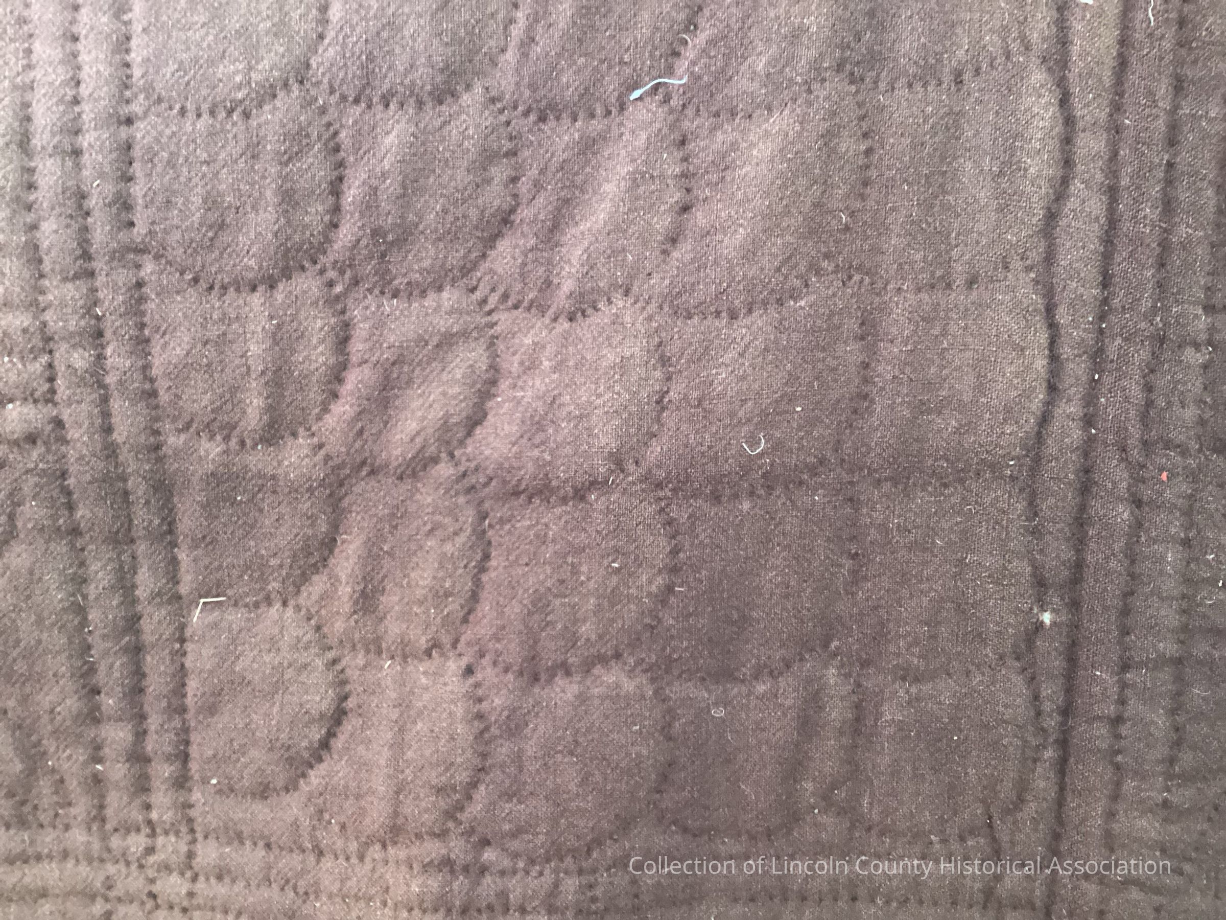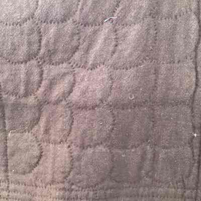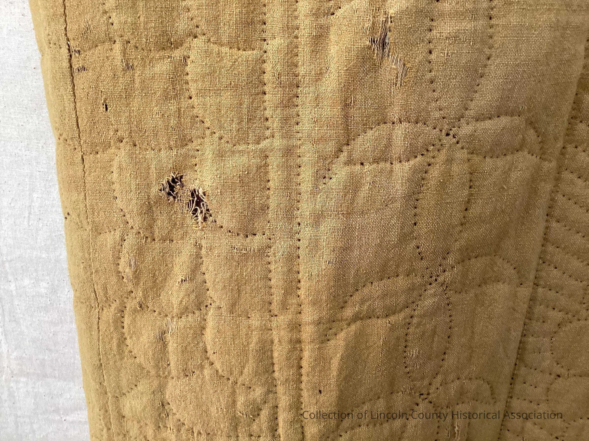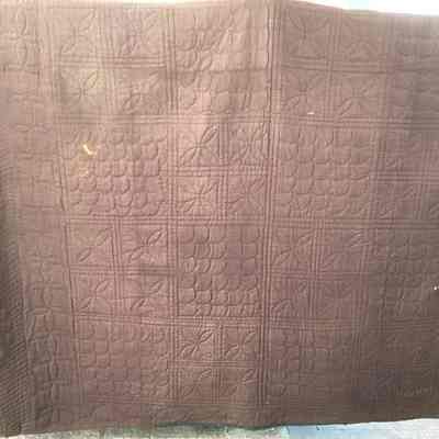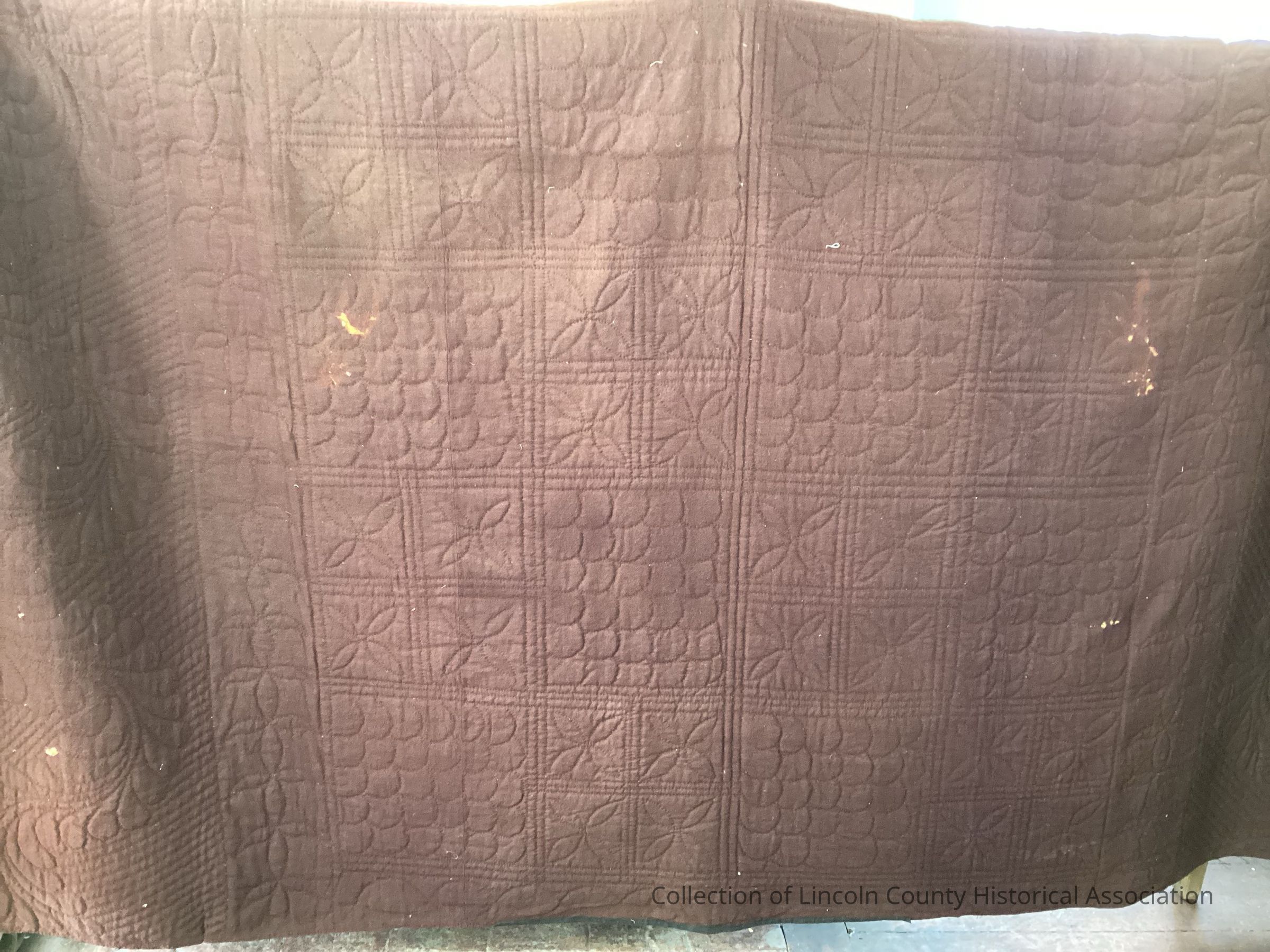 Whole cloth wool handwoven fabric quilt. Top is dark reddish brown, lining is butternut dyed hand woven fabric. Bottom of quilt is squared off to accommodate the bed posts. The quilt is hand quilted in Prince’s plume, flowers and clamshell motifs. A very large quilt with a bold pattern.Made/Created