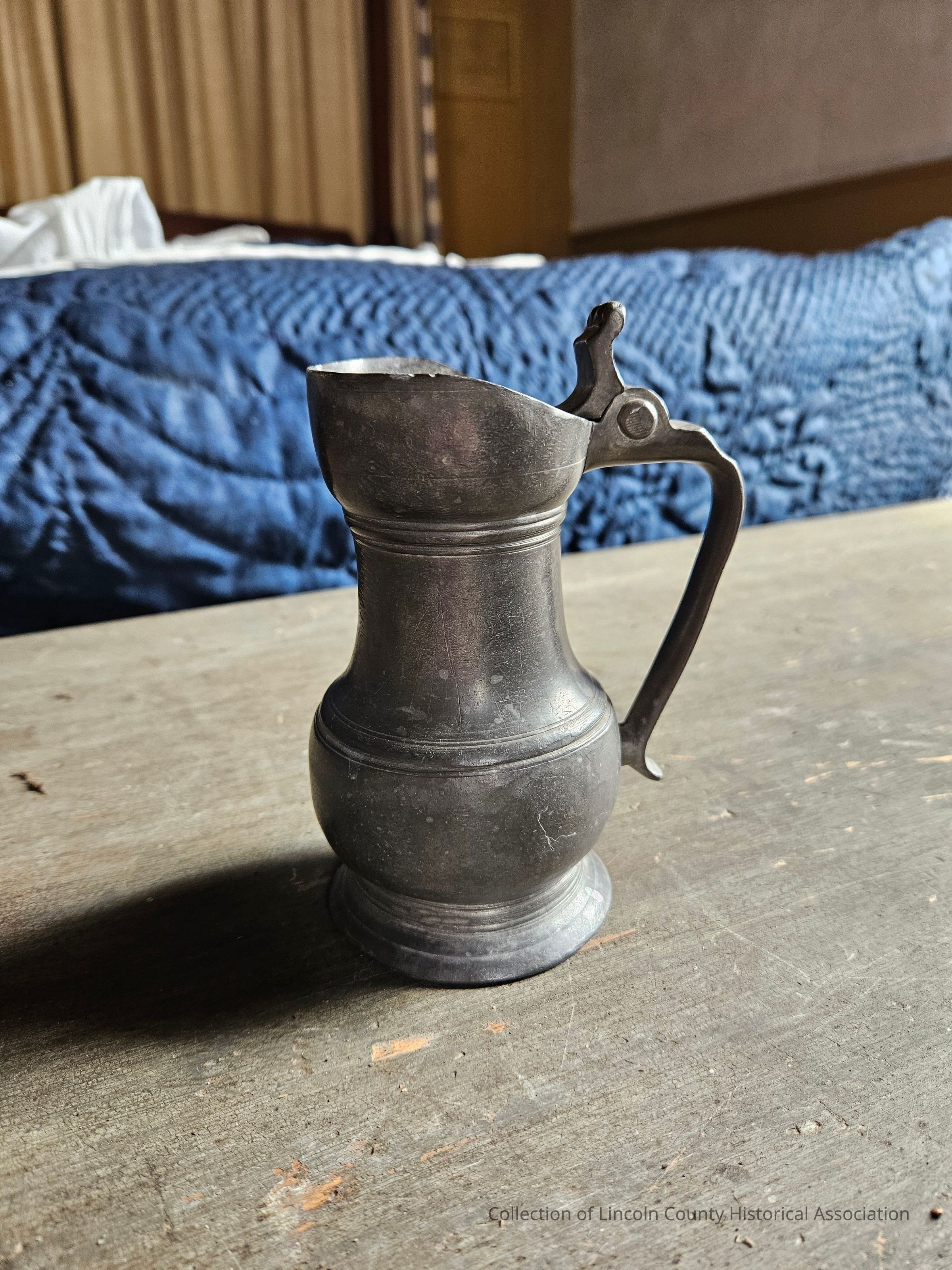 Pewter flagon with a single handle and an attached lid.