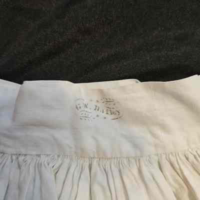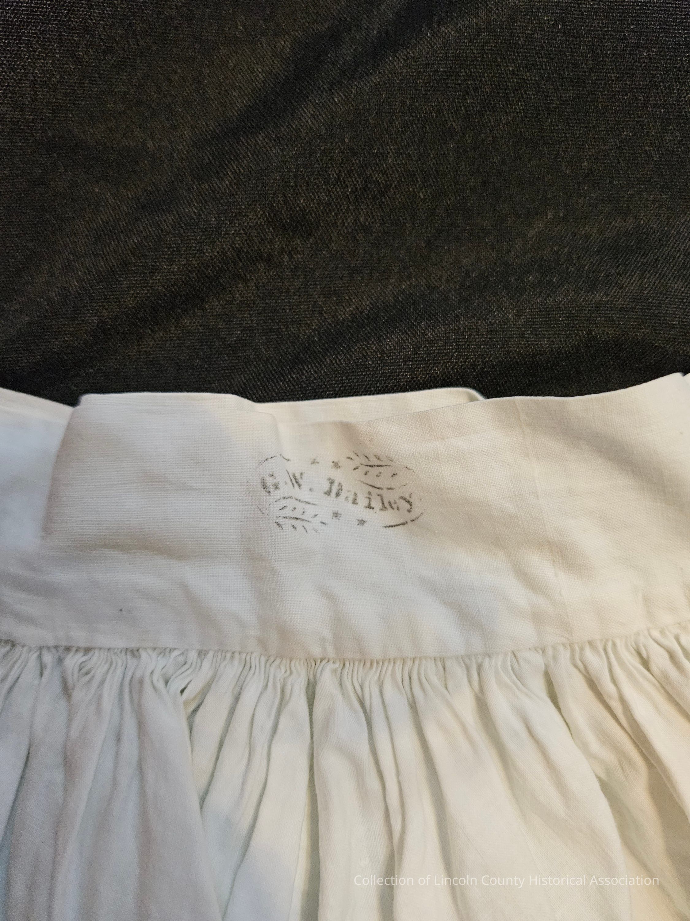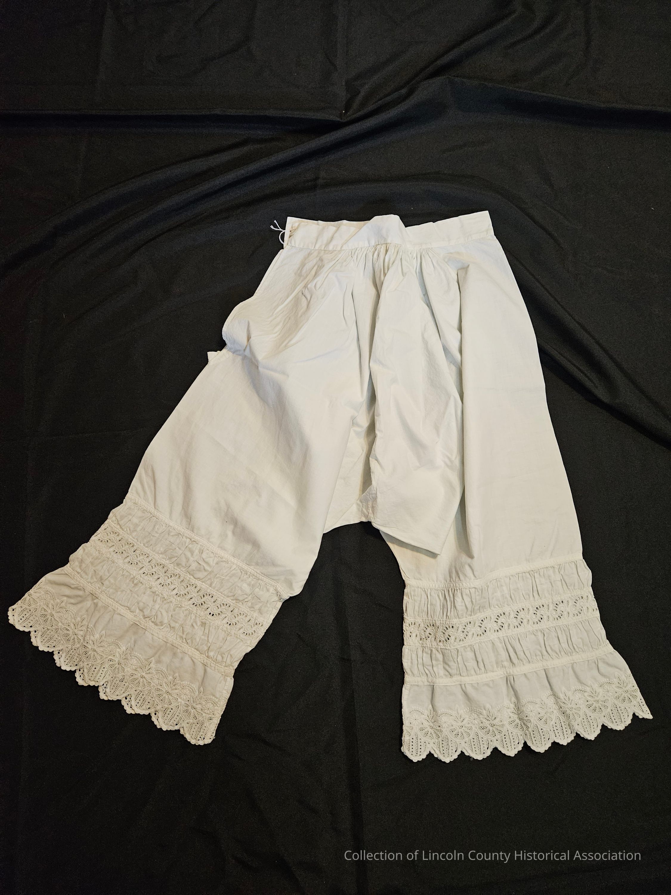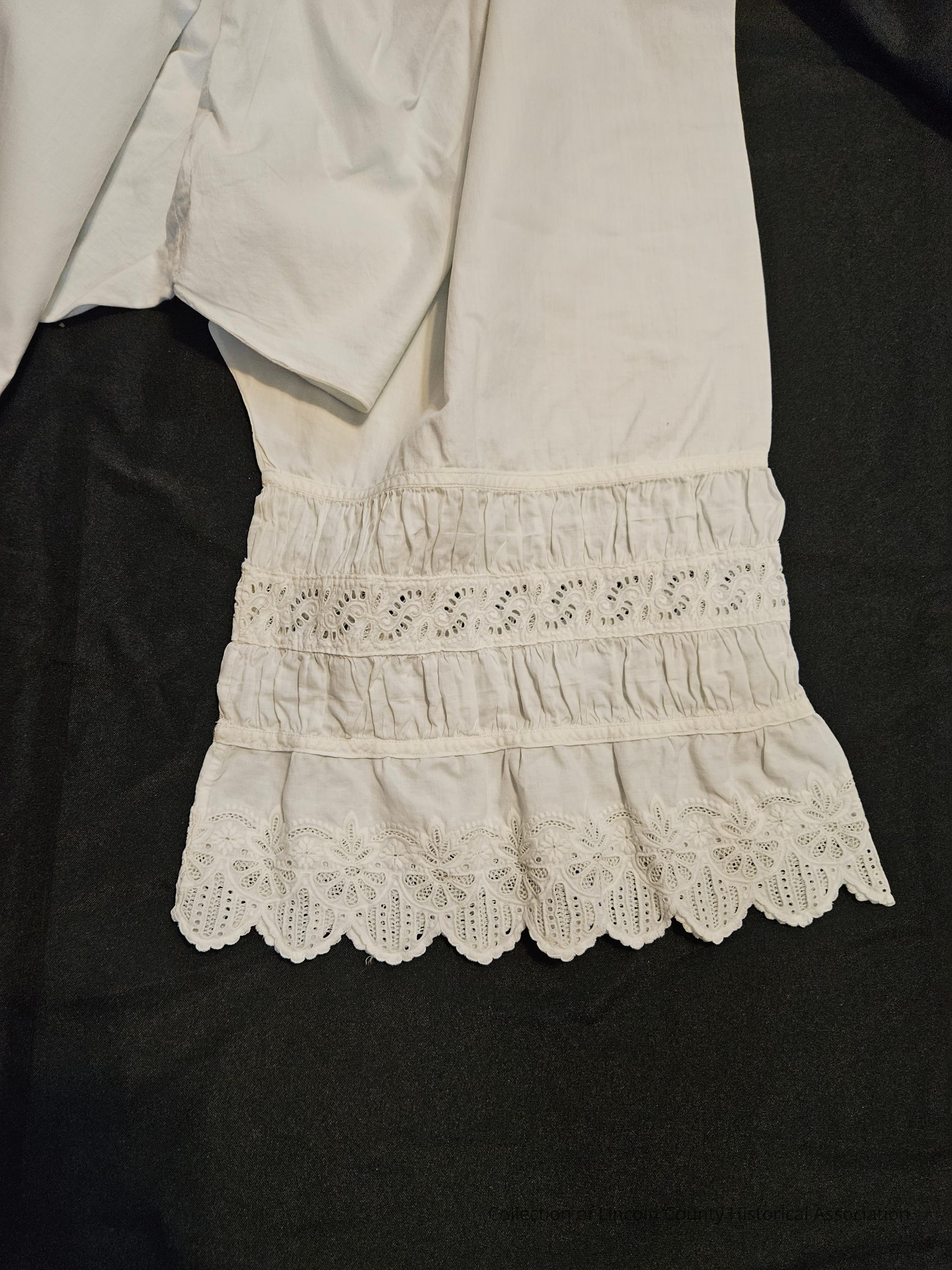 Women's white cotton underpants/drawers. Single button at waist. Rouching and machine embroidered lace incisions at bottom of pant legs. Embroidered floral and leaf designs. Machine stitched. "G.W. Bailey" stamped on back.Clothing/Dress/Costume Details