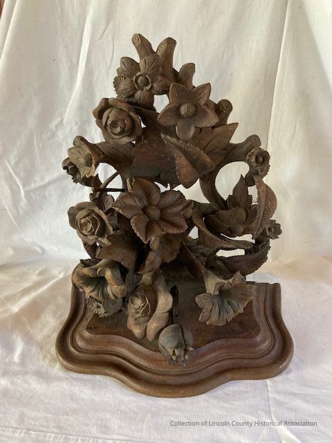 Carved wood floral arrangement. Carved in the round and set on a wood base with a pronounced curving moulding.Made/Created