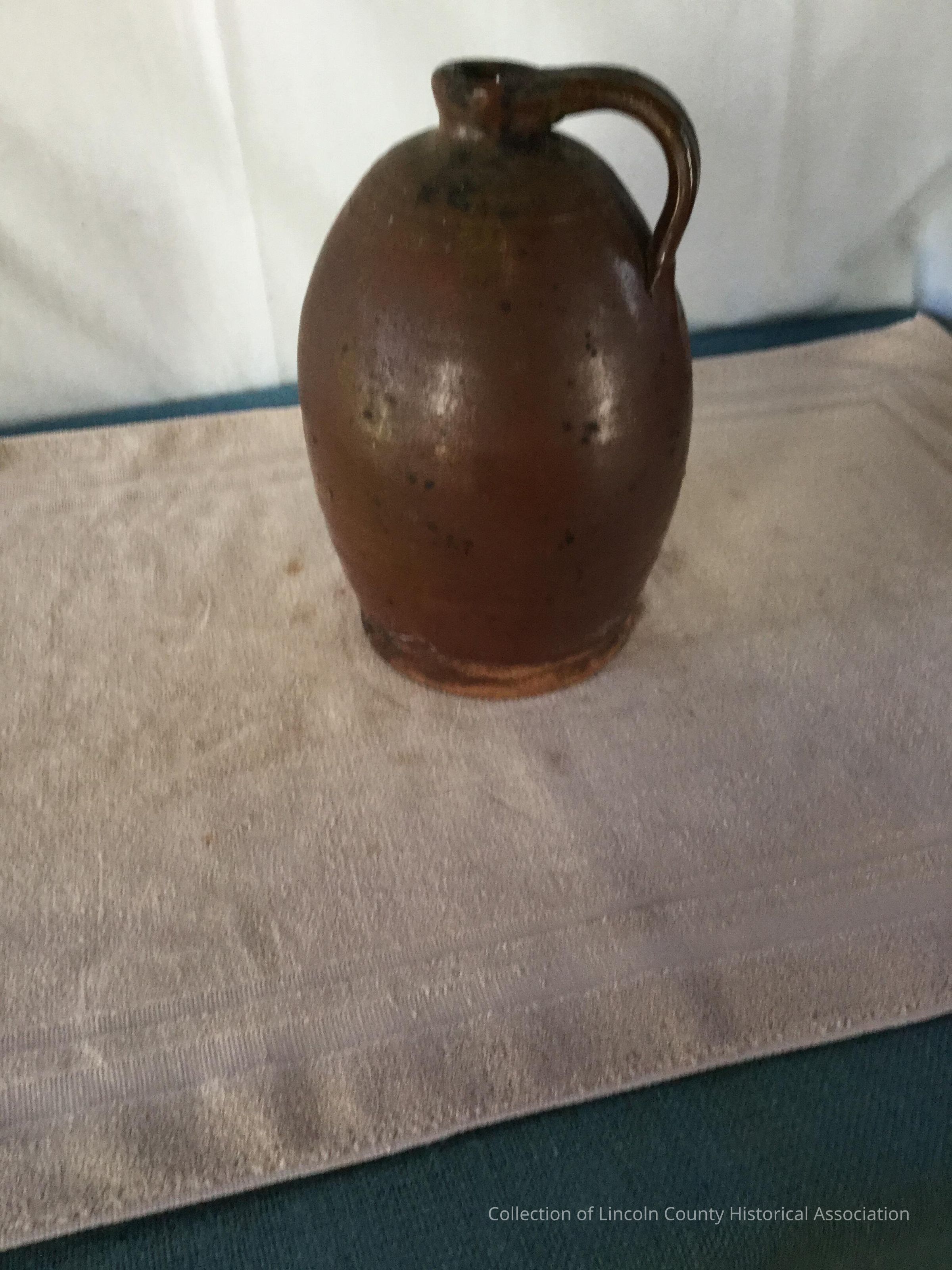 Earthenware jug with a brown glaze. With a narrow neck and a loop handle. Is slightly flared ovoid shape with an unglazed foot