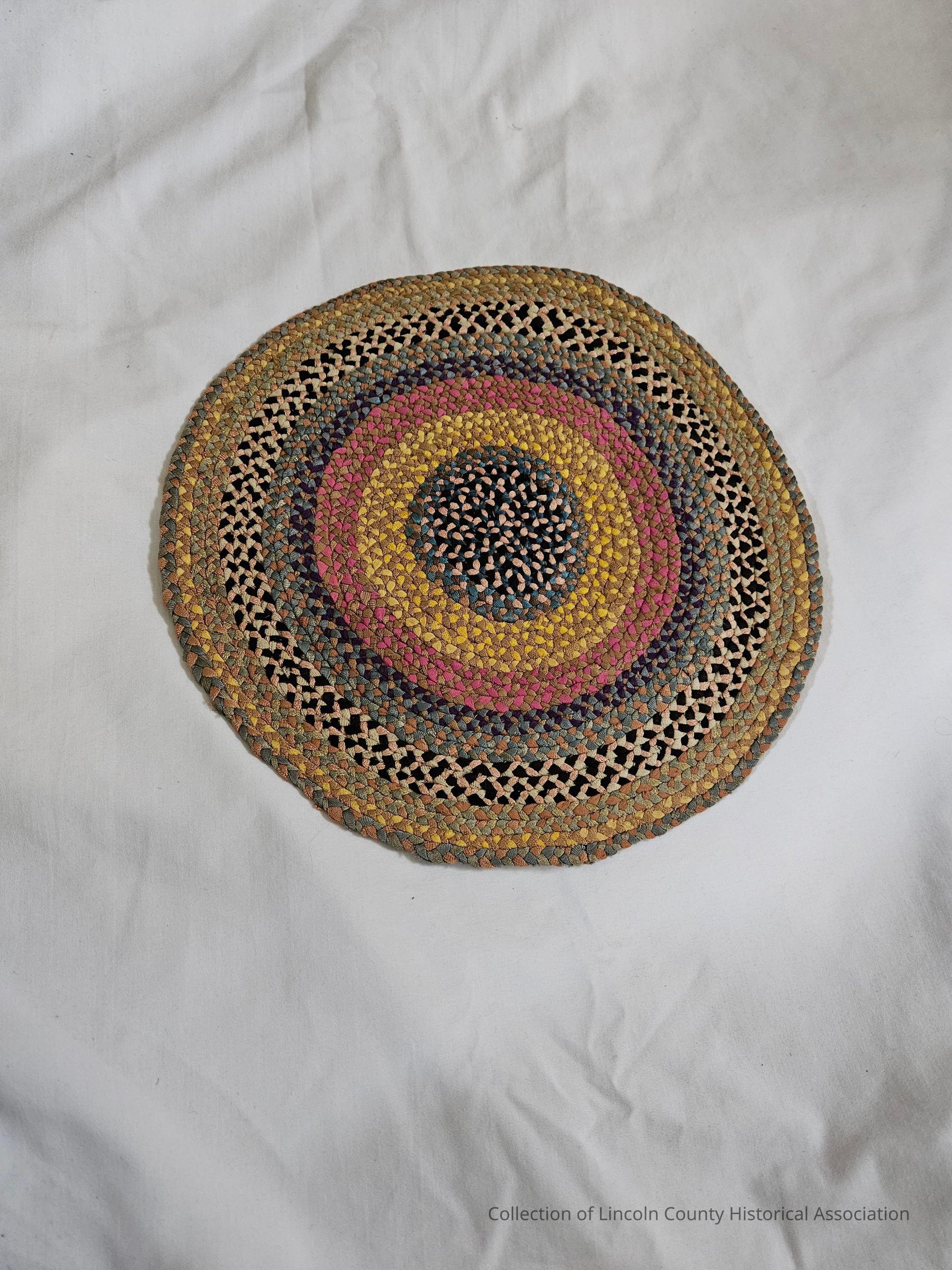 Small decorative braided rug/mat. Circular in shape. Blue, pink, and black in the center, surrounded by rings of multiple colors.Made/Created