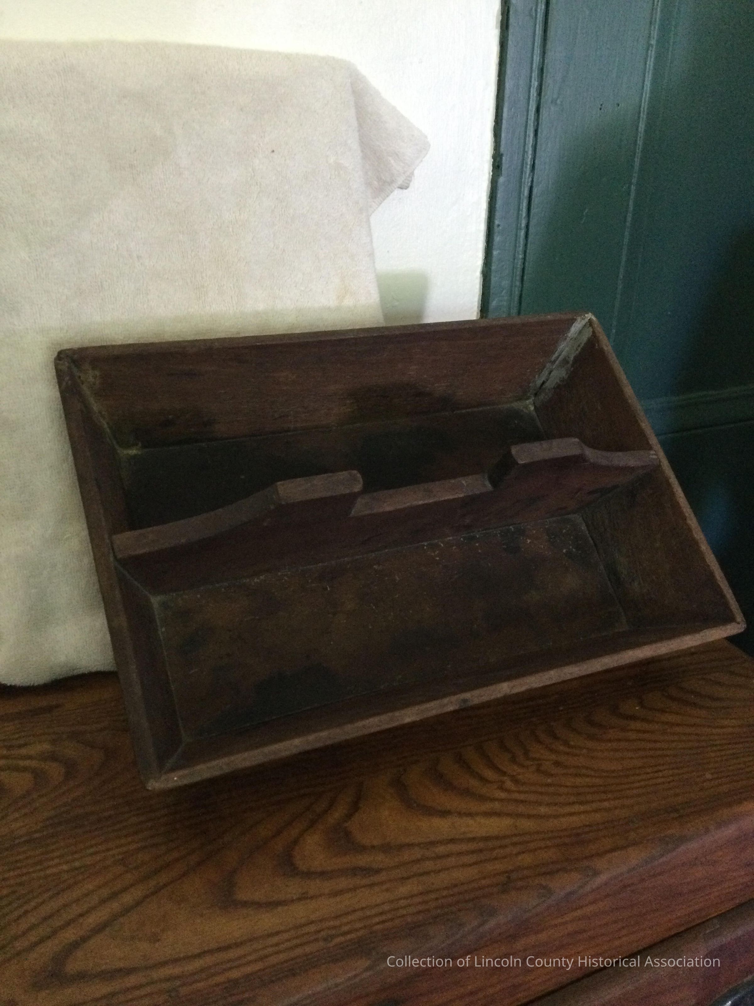 Utility tray knife box with outwardly canted sides. Partitioned at center but is missing top of its handle.Made/Created
