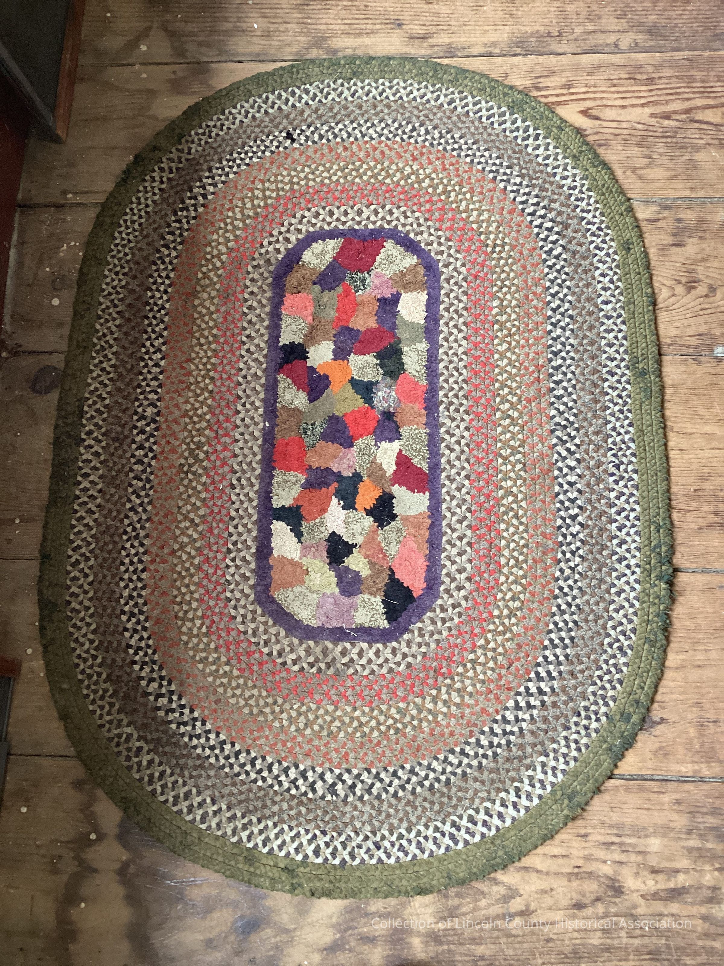 Braided rug with section of hooking in the center. Braided section white, green, and red in color. Hooked section has purple border with many different colored patches within.Made/Created