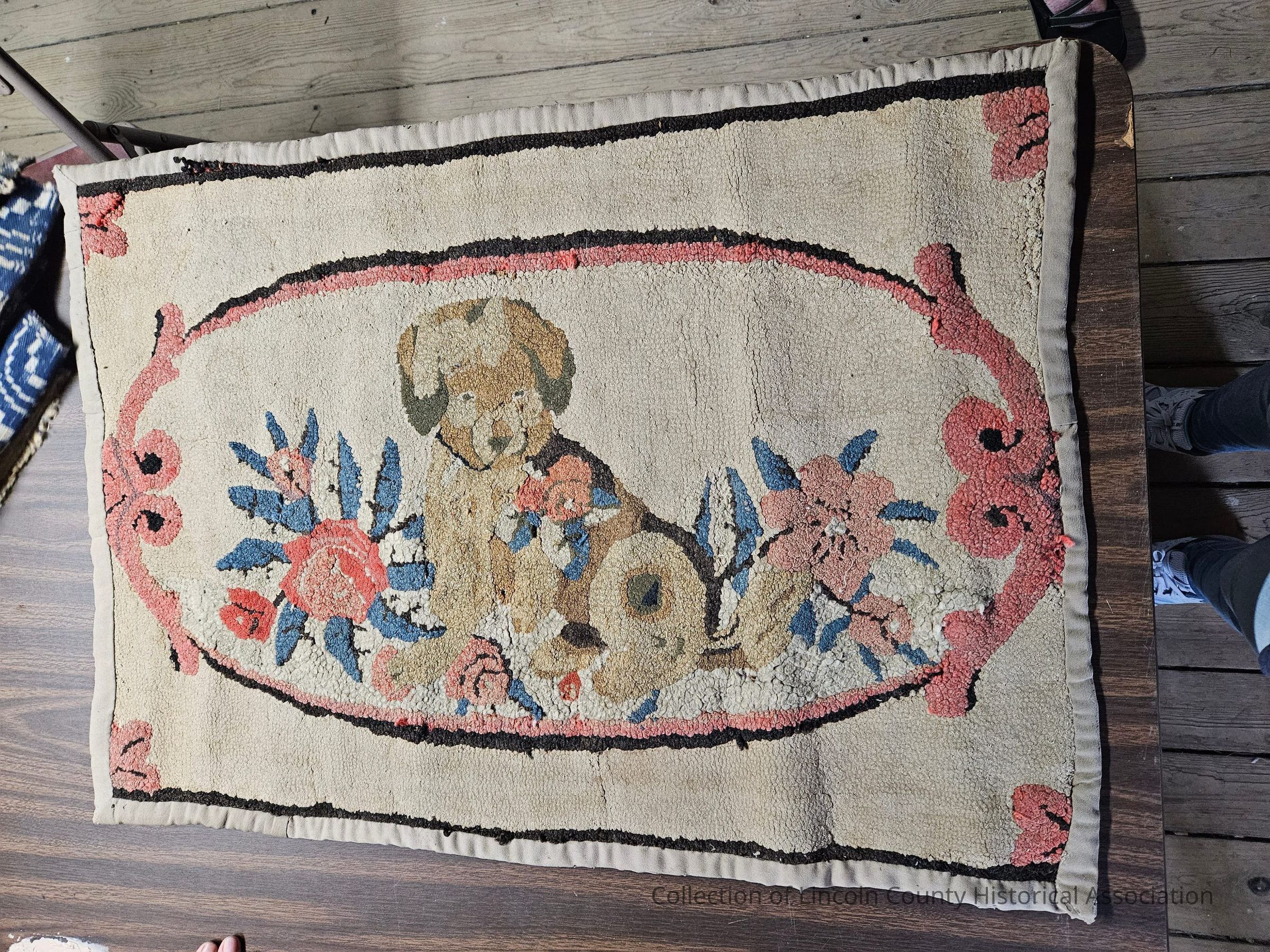 Tan hooked rug with dog in center. Pink leaves in corner and pink circle in middle surrounding dog. Also some flowers in the center of circle.Made/Created
