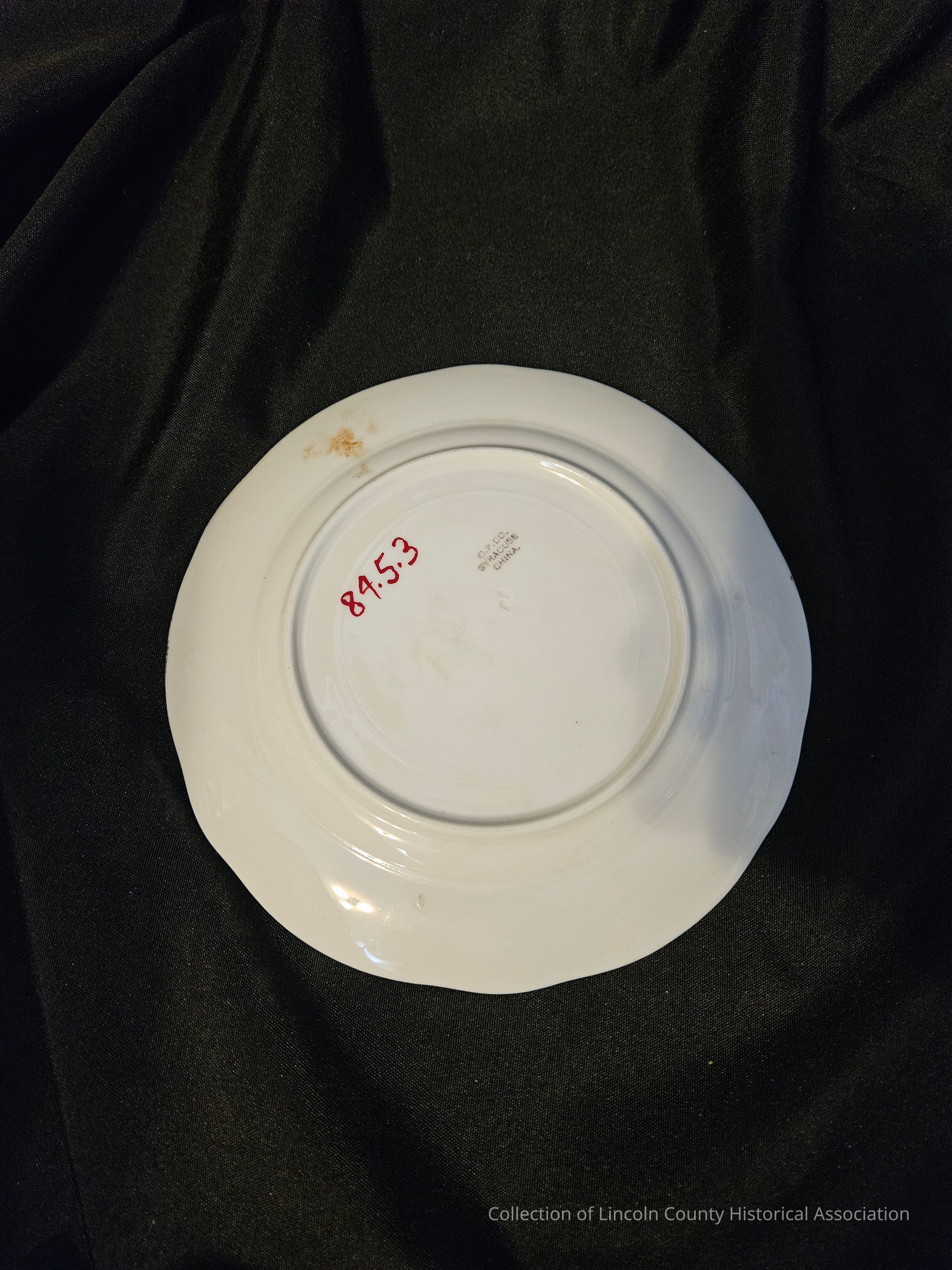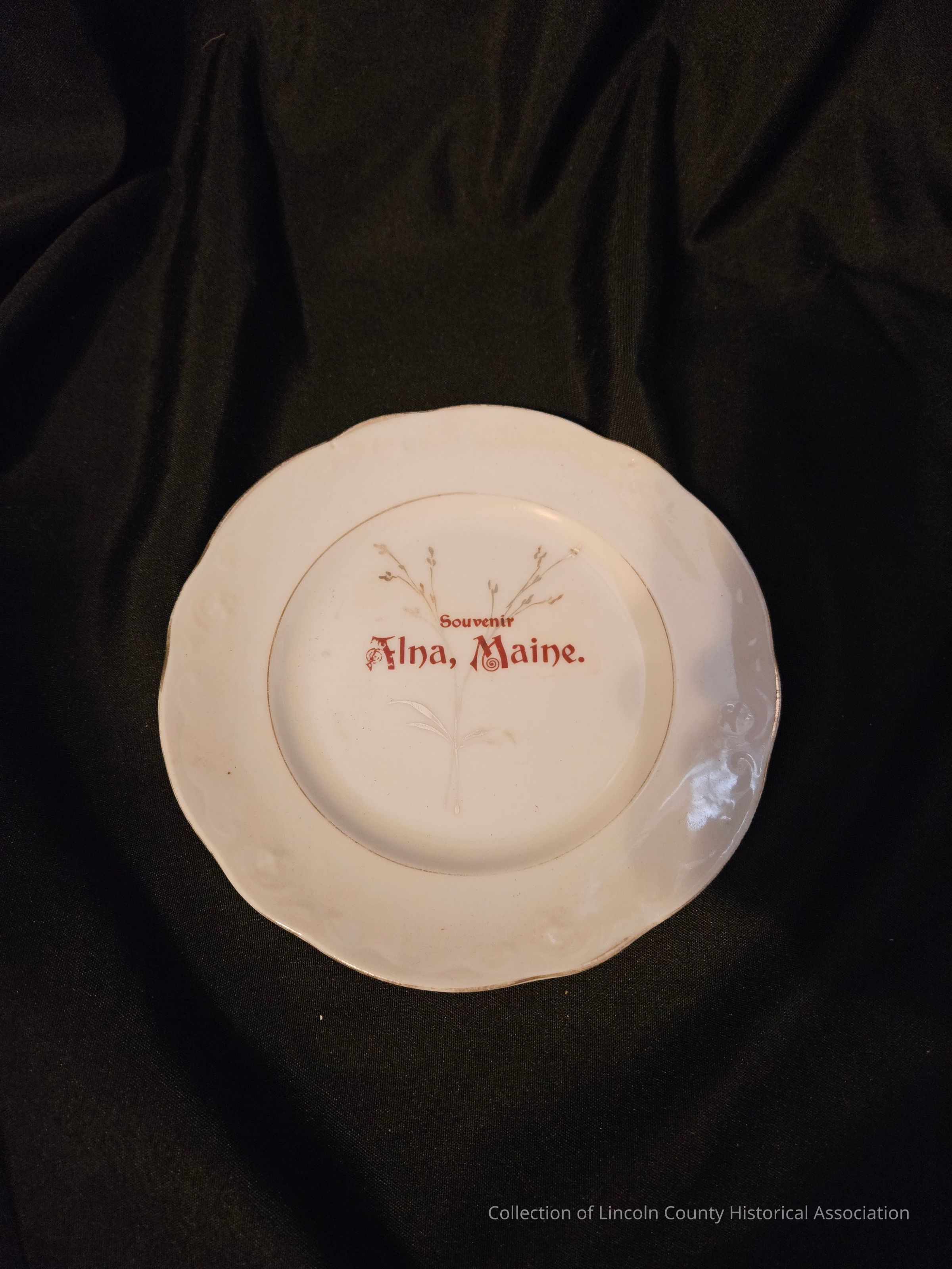 China souvenir plate. Gold trim and raised flowers around edges. Gold floral design in middle with red letter. Plate commemorates the town of Alna.Made/Created