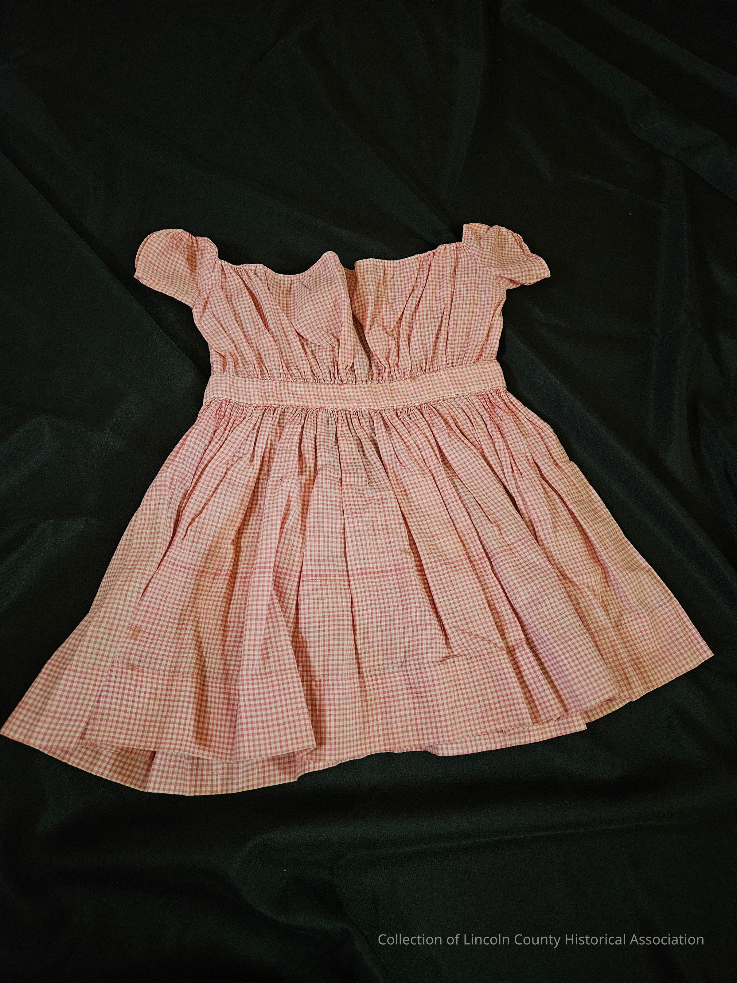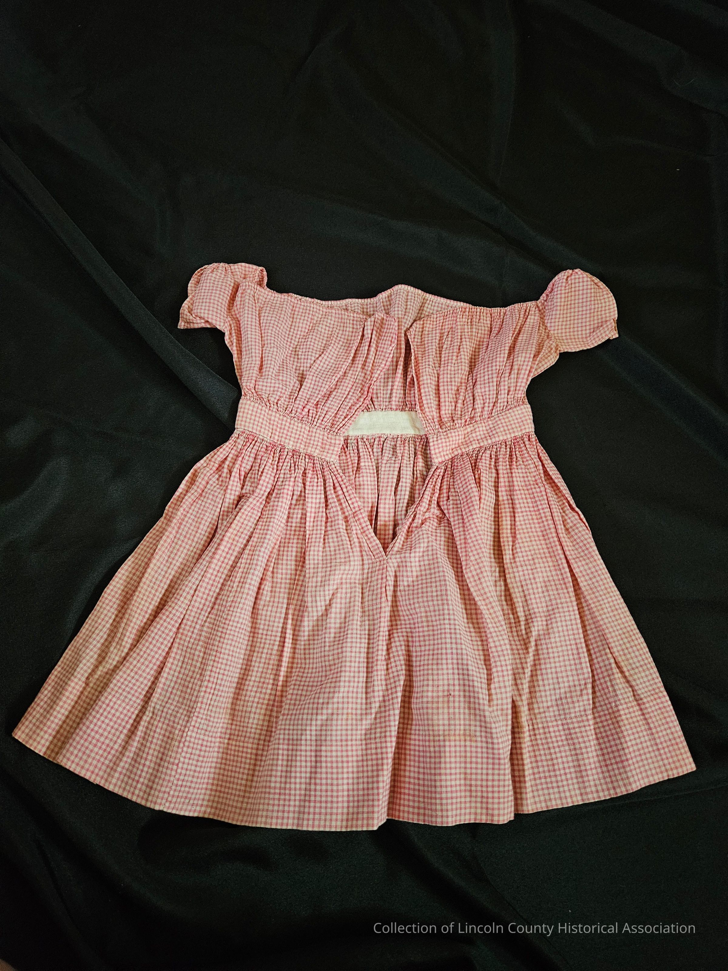 Red and white gingham children's dress. Cap sleeves. Reinforced with extra fabric band at the waist. Pleated skirt. Open in the back top half, no obvious closing mechanismClothing/Dress/Costume Details
