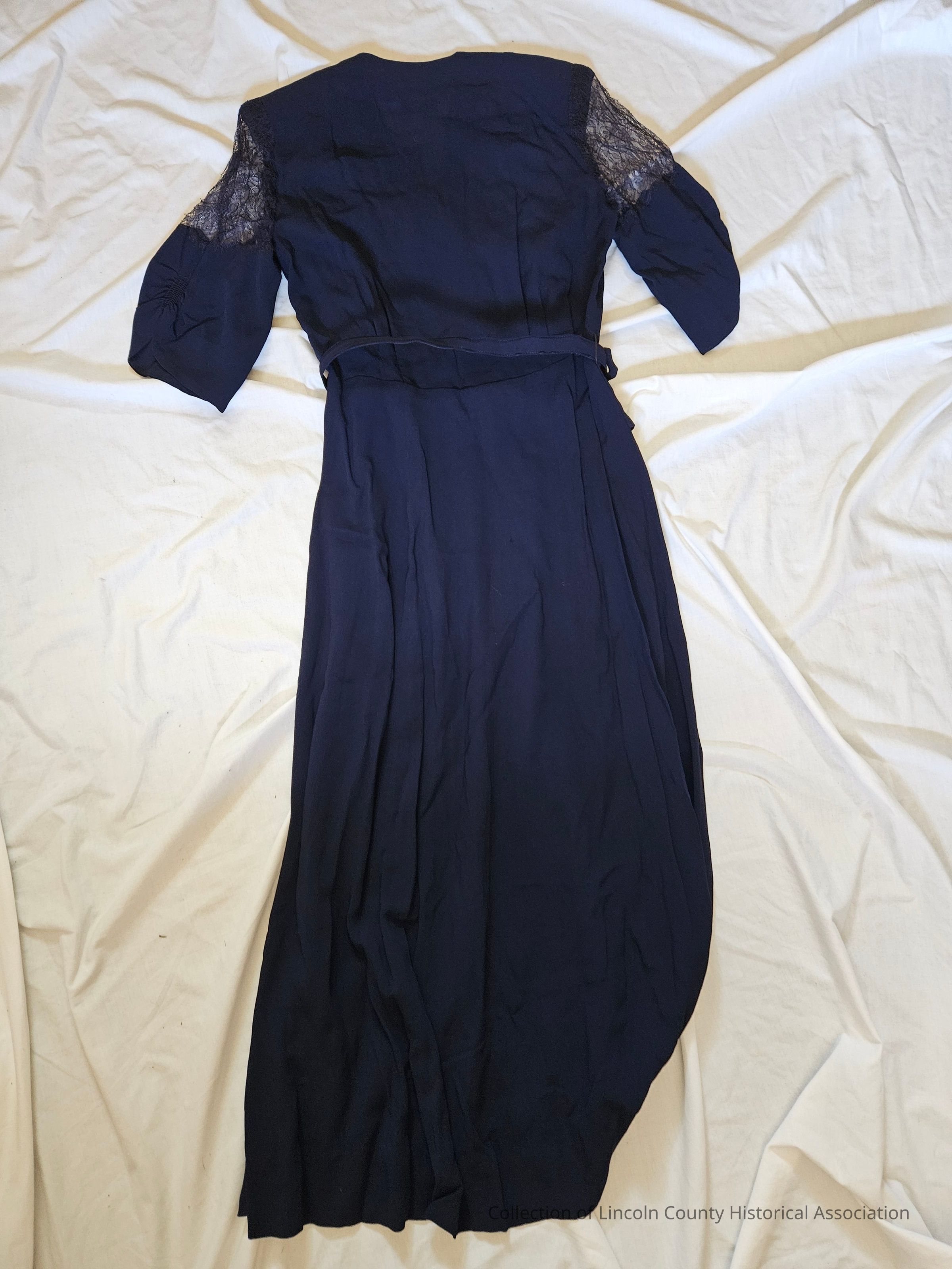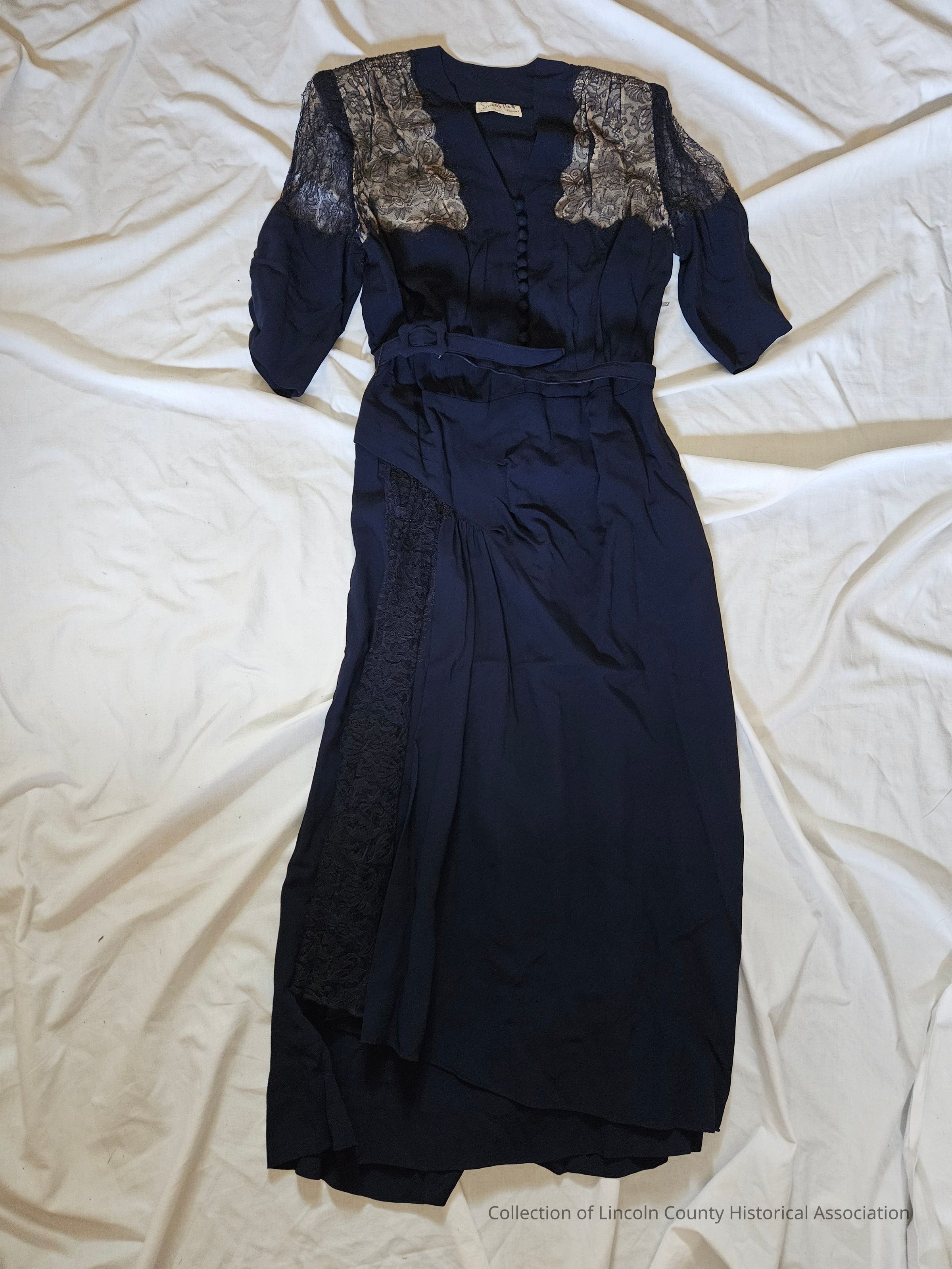 Navy blue silk crepe dress. Lace inserts at shoulder fronts. Blue lace panel down front of skirt. Narrow matching removable belt at waist. Ruffled at hem. Zipper at side and eleven buttons down the front.